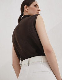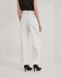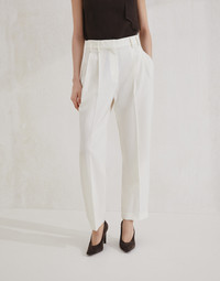 A vintage style reinterpreted in a modern way defines these virgin wool and cotton gabardine slouchy trousers. The fabric’s smooth, lightweight texture is paired with a wide silhouette, bringing to mind tailored classics with double pleats. Monili, the iconic embellishment of the Brunello Cucinelli collections, illuminates the rear belt loop, completing the garment with a delicate sparkling note. MATERIALS The gabardine combines the qualities of the natural virgin wool and cotton fibers to create a fabric that is both compact and lightweight, with a smooth texture and soft hand to guarantee pleasant comfort when worn. DETAILS Zip closure with metal hooks and backing button Slanted front pockets Double pleat Back welt pockets Unlined Nickel-free monili decoration 76% VIRGIN WOOL, 24% COTTON