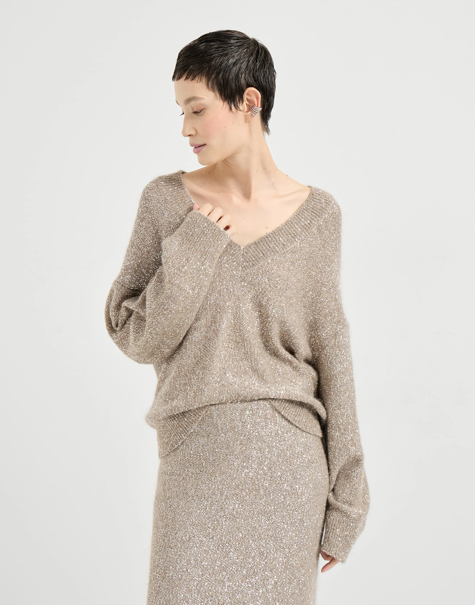 Refined natural fibers are reinterpreted with a spring-inspired feel to create this virgin wool and mohair dazzling texture sweater. A cascade of shiny sequins spreads a delicate glow throughout the garment’s surface, characterized by an extraordinary lightness and airiness. The soft silhouette features dropped shoulders, slightly generous sleeves and is completed with a very feminine V-neck. MATERIALS The intense reflections spread by the small sequins embedded into the yarn elevates the knit, made of a mohair-blend yarn with a soft, warm and cozy feel. DETAILS Rib knit V-neck Drop shoulder Rib knit cuffs and bottom band Reverse plain stitch 52% NYLON, 37% POLYESTER, 11% MOHAIR