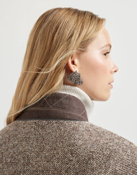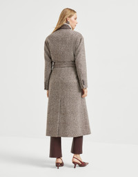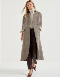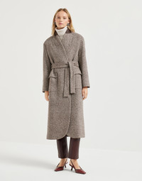 New premium Brunello Cucinelli materials enhance the timeless silhouette of this virgin wool and silk melange diagonal twill coat, reinterpreting tailored elegance with refinement. The design features classic menswear details, such as shawl lapels, flap pockets and the chest pocket, which lend a sophisticated look to the garment. The removable tie belt at the waist harmoniously defines the volumes, while an iconic monili detail behind the neck adds a feminine sparkling touch. MATERIALS Virgin wool and silk diagonal twill stands out for its angled weave and the typical textured effect of the melange yarn. Compact and structured, the fabric maintains the garment’s shape, while the softness of wool blends with the natural sheen of silk, creating a sophisticated balance between comfort and elegance. DETAILS Detachable tie belt Silk-blend crepe lining Shawl lapel Chest pocket Hand pockets Buttons at cuffs Single back vent Nickel-free monili decoration 73% VIRGIN WOOL, 22% SILK, 5% NYLON