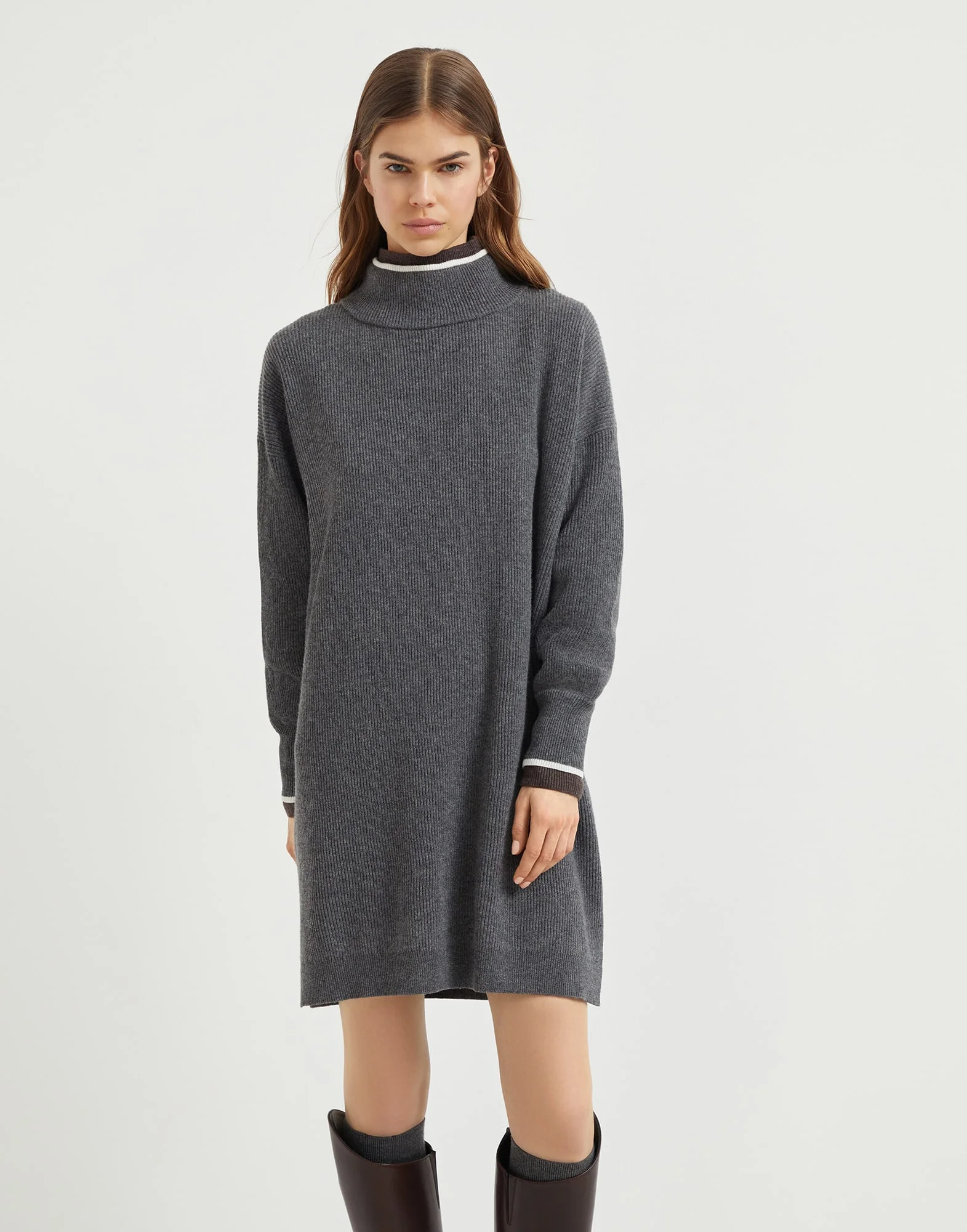 Virgin wool, cashmere and silk English rib dress with shiny contrast trims