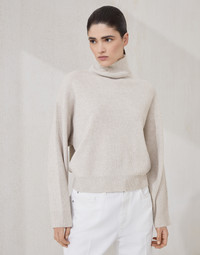 The beauty of knitwear and contemporary lines come together in this virgin wool, cashmere and silk turtleneck sweater. The classic feel of English rib knitting is paired with the yarn’s natural softness and the relaxed silhouette with slightly dropped shoulders that help to make the garment comfortable to wear. MATERIALS Thanks to refined workmanship, the virgin wool, cashmere and silk yarn offers lightness and comfort when worn, providing the right amount of protection that is essential between seasons. DETAILS High collar Drop shoulder English rib 60% VIRGIN WOOL, 30% CASHMERE, 10% SILK
