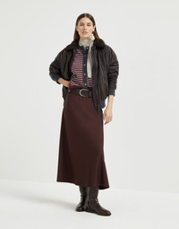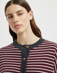 The excellence of Brunello Cucinelli yarns elevates the casual feel of this virgin wool, cashmere and silk striped cardigan. With a distinctly sporty attitude, the two-tone striped pattern stands out on the garment’s soft, silky surface. The fit offers relaxed proportions with dropped shoulders and slightly wide sleeves. The metal buttons of the closure and hand pockets stand out on the contrasting trim, completing the cardigan with an elegant touch. MATERIALS The refined virgin wool, cashmere and silk yarn offers lightness and comfort when worn, without sacrificing the right amount of protection that is essential between seasons. DETAILS Metal button closure Crew-neck Drop shoulder Balloon sleeve Hand pockets Plain stitch 60% VIRGIN WOOL, 30% CASHMERE, 10% SILK