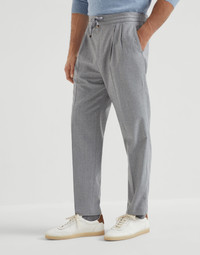 The casual feel of these drawstring trousers is enriched by the excellence of Brunello Cucinelli’s craftsmanship. The flannel’s diagonal pattern and the double pleats on the front convey the garment’s tailored inspiration. The modern leisure fit offers soft proportions in the seat and a slight low-rise, while the cut of the leg remains close to the body. MATERIALS The soft, lightweight pure wool flannel enhances the noble qualities of the natural fiber, while the twill weave showcases the fabric’s characteristic diagonal texture. The knee-length lining provides added comfort. DETAILS Zipper closure with metal hook, inner-button and drawstring Slanted front pockets Double pleat Back welt pockets Plain hem Lining to knee Leisure fit: the rise and seat are soft and the proportions of the leg are tapered 100% VIRGIN WOOL