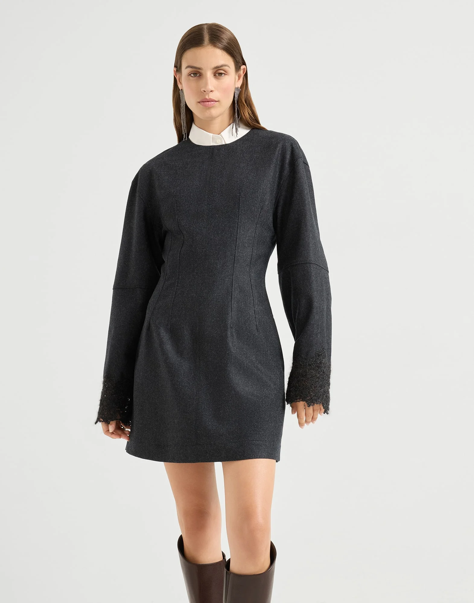 Sophisticated workmanship and a feminine allure define the style of this new virgin wool flannel mini dress with wispy lace cuffs. Inspired by men’s tailored elegance, the refined fabric hugs the silhouette while harmoniously highlighting the waist. The cuffs are enriched with a seasonal embroidery that reproduces a dynamic, textured pattern for a distinctive, elegant touch. MATERIALS The worsted pure virgin wool yarn enhances the rich, compact look of flannel, a traditional menswear fabric. DETAILS Crew-neck Zip closure Silk-blend crepe lining 100% VIRGIN WOOL