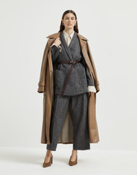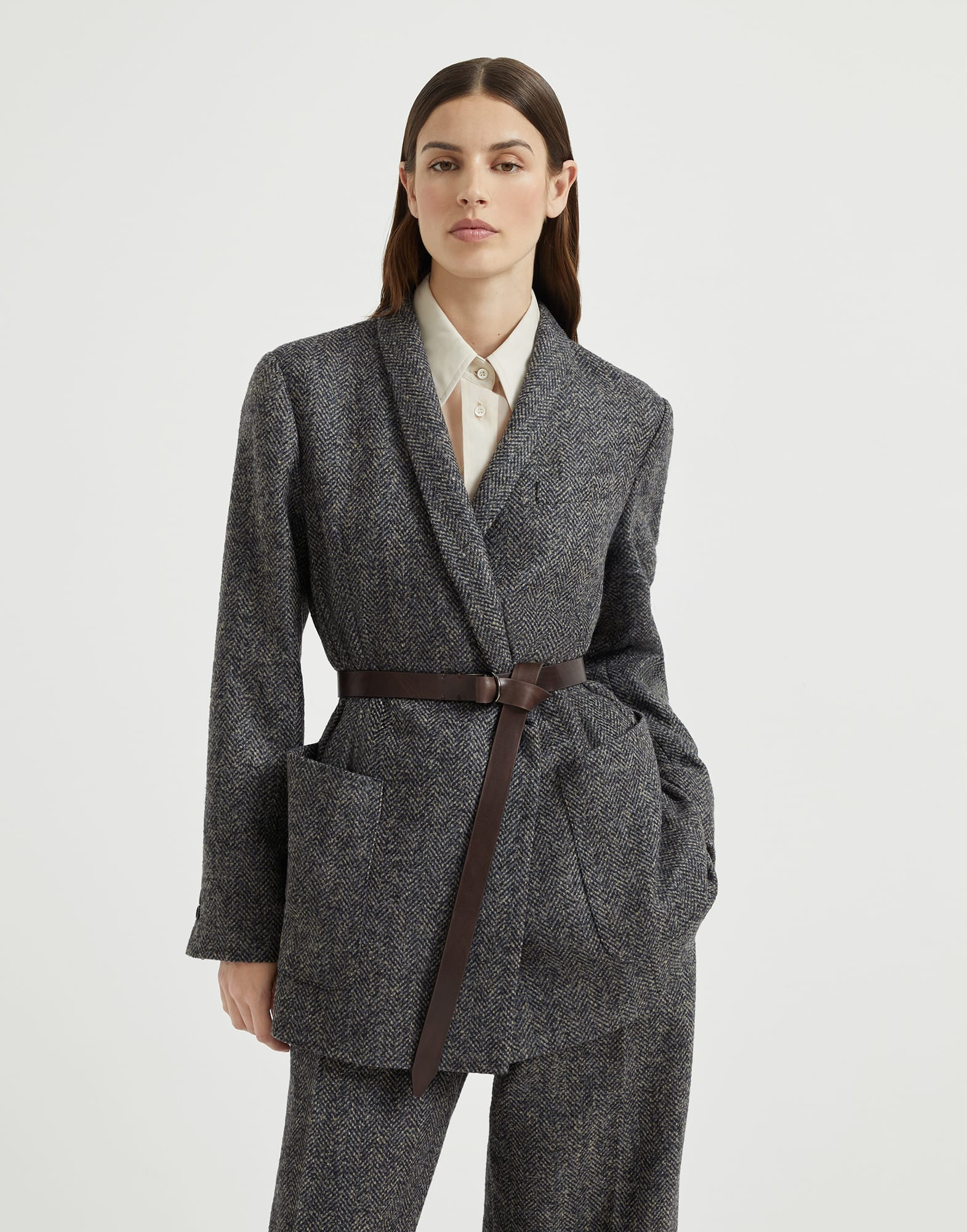 British inspiration and precious details harmoniously come together in this new virgin wool herringbone tweed blazer that reinterprets sartorial tradition with a contemporary feel. With a warm, cozy texture, the refined fabric adds visible depth to the garment, while the stand collar lends a structured yet feminine allure, underscoring a timeless elegance. A reference to the equestrian world, the leather belt gathers the silhouette’s volume, highlighting the waist in a proportional way and creating a perfect balance between style and function. A fine row of shiny monili, the iconic embellishment of the Brunello Cucinelli collections, completes the blazer with a delicate sparkling note. MATERIALS The virgin wool tweed is a warm, resistant fabric, characterized by a slightly irregular surface and a substantial hand. Traditionally associated with the style of British menswear, it stands out for its textured appearance and the typical slightly melange herringbone design. DETAILS Horn button closure Unlined Shawl lapel Chest pocket Hand pockets Cuffs have four horn buttons Detachable belt Single back vent Nickel-free monili decoration 73% VIRGIN WOOL, 27% NYLON