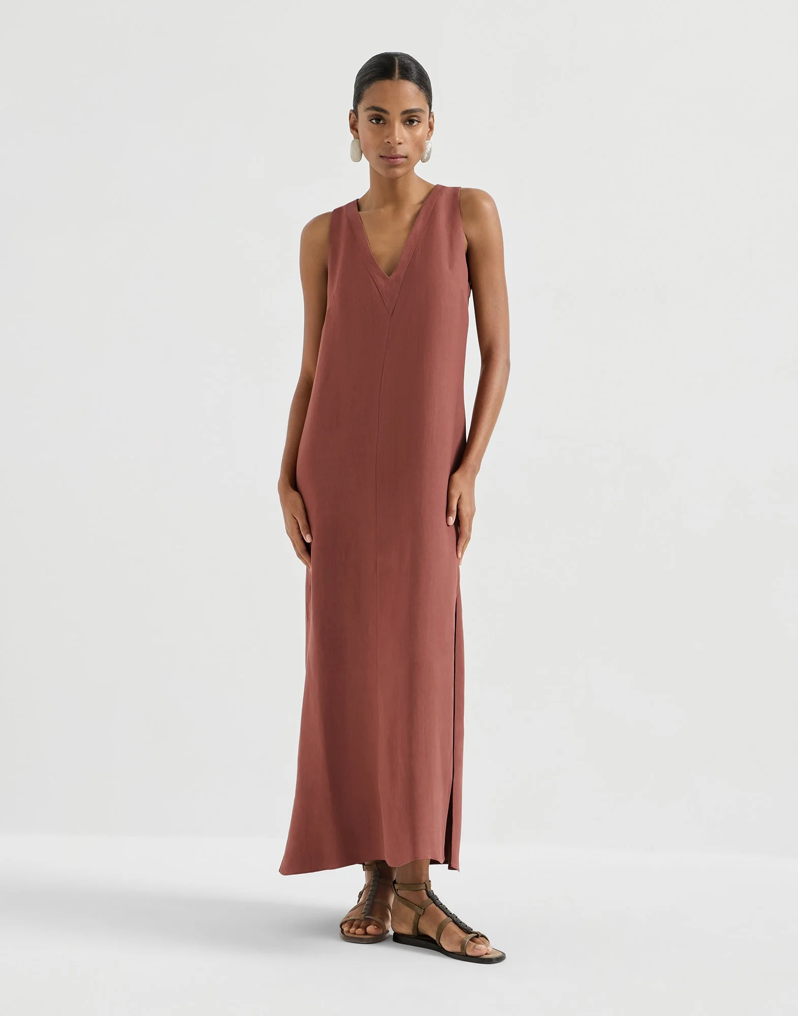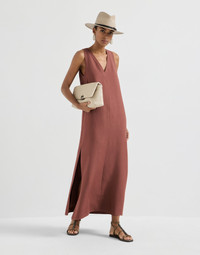 Precious details enrich the essential lines of this viscose and linen fluid twill dress. The light, flowing fabric complements the garment’s silhouette, which features a V-neck and side slits that create a sense of movement for a touch of feminine, casual elegance. A shiny monili embroidery completes the dress with a sparkling note in true Brunello Cucinelli style. MATERIALS The blend of viscose and linen gives the twill a lightweight, very fluid appearance that is semi-crisp at the same time. DETAILS V-neck Zip opening at back of neck Side vents at bottom Silk-blend crepe lining Nickel-free monili decoration 72% VISCOSE, 28% LINEN