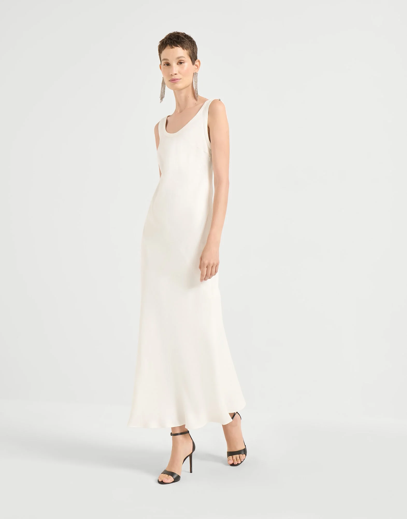 Precious details enrich the essential lines of this viscose and linen Fluid twill Tank dress. The lightweight, flowing fabric is perfectly suited for the casual silhouette conveying a feminine, summery allure. The top’s close-fitting volumes develop into a slightly flared skirt. The shiny monili embroidery complements the dress with an elegant sparkling touch, in true Brunello Cucinelli style. MATERIALS The blend of viscose and linen gives the twill a lightweight, very fluid appearance that is semi-crisp at the same time. DETAILS Wide neckline Low back neckline at back Side zip closure Silk-blend crepe lining Nickel-free monili decoration 72% VISCOSE, 28% LINEN