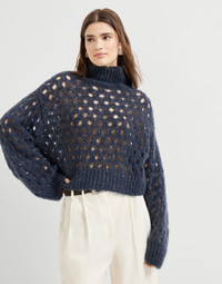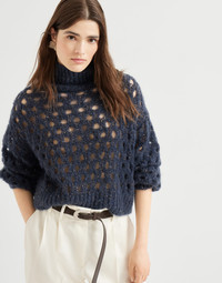 Skillful workmanship and refined materials enrich this wispy mohair and wool dazzling net turtleneck sweater. The classic net stitch knitting, which plays with solid and empty spaces, is enhanced with the shiny touch of small sequins that spread delicate radiant reflections throughout the garment’s surface. The rib knit edges and the turtleneck complete the style of the garment. MATERIALS The wispy mohair and wool yarn is characterized by a lightweight, airy texture with a soft, full appearance that enhances the qualities of the natural fibers. A fine string enriched with sparkling sequins spreads precious reflections along the garment’s surface. DETAILS High collar Drop shoulder Wide sleeve Net knitting 54% MOHAIR, 26% NYLON, 15% POLYESTER, 5% WOOL