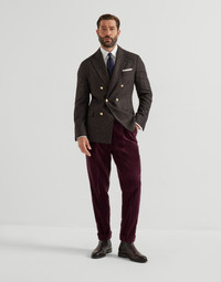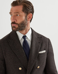 An elegant silhouette and refined yarns add a distinctive elegance to this Prince of Wales one-and-a-half-breasted deconstructed blazer, completed with metal buttons. The classic tailored pattern comes to life thanks to a distinctive nuanced and irregular effect created by the light blend of wool, alpaca and silk. The “Solomeo Shoulder”, named after the hamlet where the company is located, characterizes the Brunello Cucinelli blazer with signature proportions. The tapered and pronounced cut of the shoulder enhances the male physique without the need for padding. MATERIALS Exceptionally long and airy, the alpaca fibers infuse the warm, luminous blend of wool and silk with a touch of lightness and a distinctive nuanced effect that enhances the tailored Prince of Wales pattern. The ultra-lightweight cupro lining provides the garment with added comfort. DETAILS 6 metal button closure Peak lapel Welt pockets with flap, ticket pocket and chest pocket Cuffs have four metal buttons and functional buttonholes Cupro half lining Two interior pockets with button closure and pen holder Double back vent Drop 7 41% WOOL, 40% ALPACA, 19% SILK