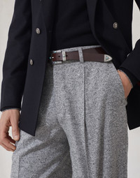 The skillful combination of refined yarns and textile tradition elevate the contemporary feel of these leisure fit trousers, completed by the pleats on the front. The sophisticated color stands out thanks to the distinctive weave of the wool and cashmere grisaille, a light, comfortable fabric enriched by the slightly mottled effect of the flecked yarn. The modern leisure fit offers soft proportions in the seat and a slight low-rise, while the cut of the leg remains close to the body. MATERIALS The alternating grisaille threads enrich the season’s colors thanks to the special mottled effect of the flecked yarn, while the wool and cashmere fibers provide the fabric with exceptional warmth and lightness. The cupro lining provides the garment with added comfort. DETAILS Zip closure with button, metal hook and backing button Slanted front pockets Pleat Back welt pockets Cuffed hem Lining to knee 95% WOOL, 5% CASHMERE