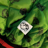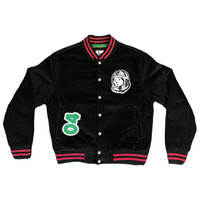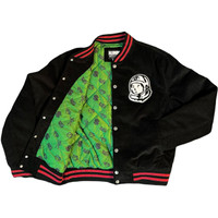 Billionaire Boys Club Monies Jacket Brand Introduction: Designed by the visionary Pharrell Williams and his manager Robert Walker, in collaboration with Japanese fashion mogul Nigo, Billionaire Boys Club (BBC) represents the pinnacle of luxury sportswear and streetwear. Known for its vibrant colors and innovative patterns, BBC clothing combines high-end materials and classic vintage style. The brand maintains its exclusivity by offering its apparel in only about forty stores worldwide. Product Details: Size: XXL Measurements: Length - 27.5in (70 cm), Chest - 25in (63 cm) Materials: Shell: 100% Cotton – provides a soft, breathable quality while maintaining durability. Lining: 100% Polyester – ensures warmth and comfort with a luxurious quilted design. Closure: Snap button-up front closure ensures a secure and stylish fit. Collar, Cuffs, and Waist: Striped ribbed detailing on the collar, wrist cuffs, and waistline, adding a touch of classic sportswear elegance.