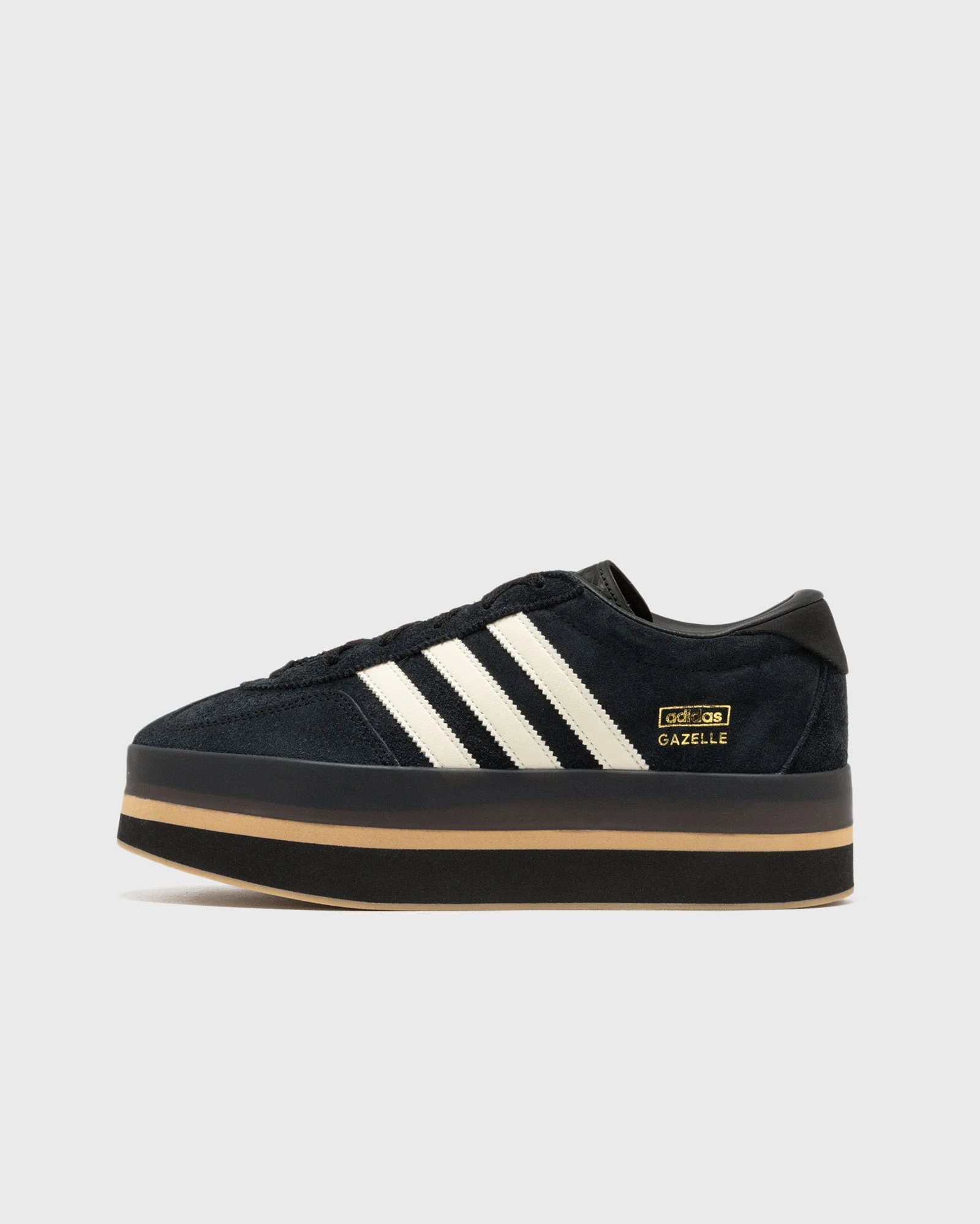 Once a legendary training shoe, today a strong fashion statement. This version of the Gazelle Stack takes style to a new level with its high EVA platform sole. The upper made of soft leather with suede details and the slightly transparent plastic strip exude a trendy retro vibe. - Upper made of suede and leather - Nubuck tongue - Pre-shaped EVA midsole - Synthetic lining - Rubber outsole Article number: JS0239 Gender: women Color: CBLACK/CREWHT/GUM3 Material: 30% Rubber, 70% Synthetic/Textile