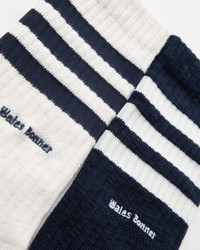 The Spring/Summer 2025 collection by adidas and Wales Bonner combines classic sportswear with high-quality craftsmanship. The silhouettes, materials and colors reflect the maritime influence that can be felt in the seaside cities. The adidas x Wales Bonner socks are available in a 2-pack. The soft, comfortable socks have ribbed cuffs and both embroidered and integrated logos in contrasting colors. - Calf-length - Ribbed cuffs This product is partly made of certified recycled material. Get sustainable products from Adidas now at BSTN! Article Number: JV8684 Gender: Men, Women Color: NTNAVY/CWHITE Material: 79% Cotton, 18% Polyester, 3% Spandex/elastane