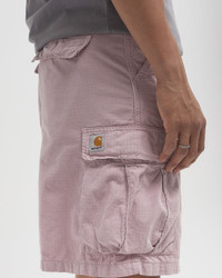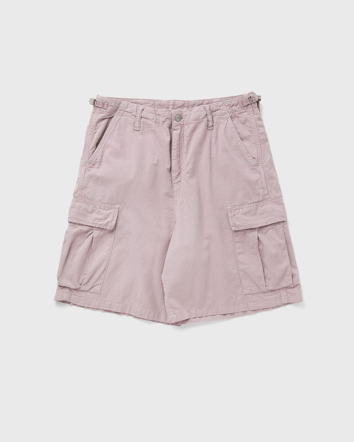 The Alan Cargo Short by Carhartt WIP is made from a mid-weight cotton and canvas ripstop with a regular waist. There are pockets on the front, sides and back, while a woven square label completes the design. - Relaxed fit, regular rise - Adjustable waistband - Side and back pockets with flaps and buttons - Bar-tacked seams in high-wear areas - Zip fly - Square label Article Number: I034815-2P8.GD Gender: Men Color: HORTENSIA GARMENT DYED Material: 81% Cotton, 15% Linen