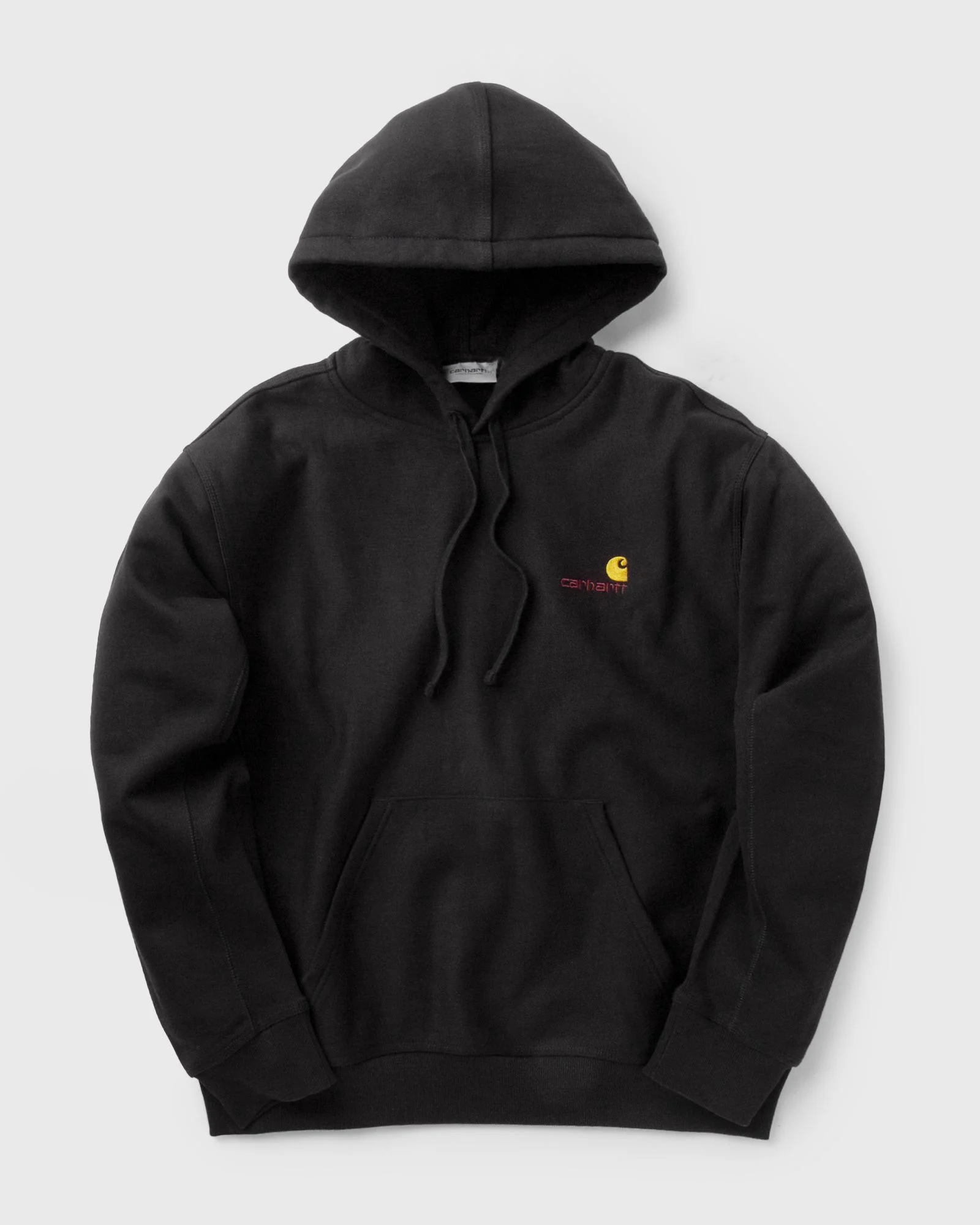 The American Script Hoodie from Carhartt is made from cotton-polyester fabric and brushed for extra softness and warmth. The breathable top is equipped with a drawstring hood, a pouch pocket and a loose fit. The design is rounded off with subtle embroidery. Article Number: I028279-89.XX Gender: Men Color: Black Material: Full: 80% Cotton, 20% Polyester