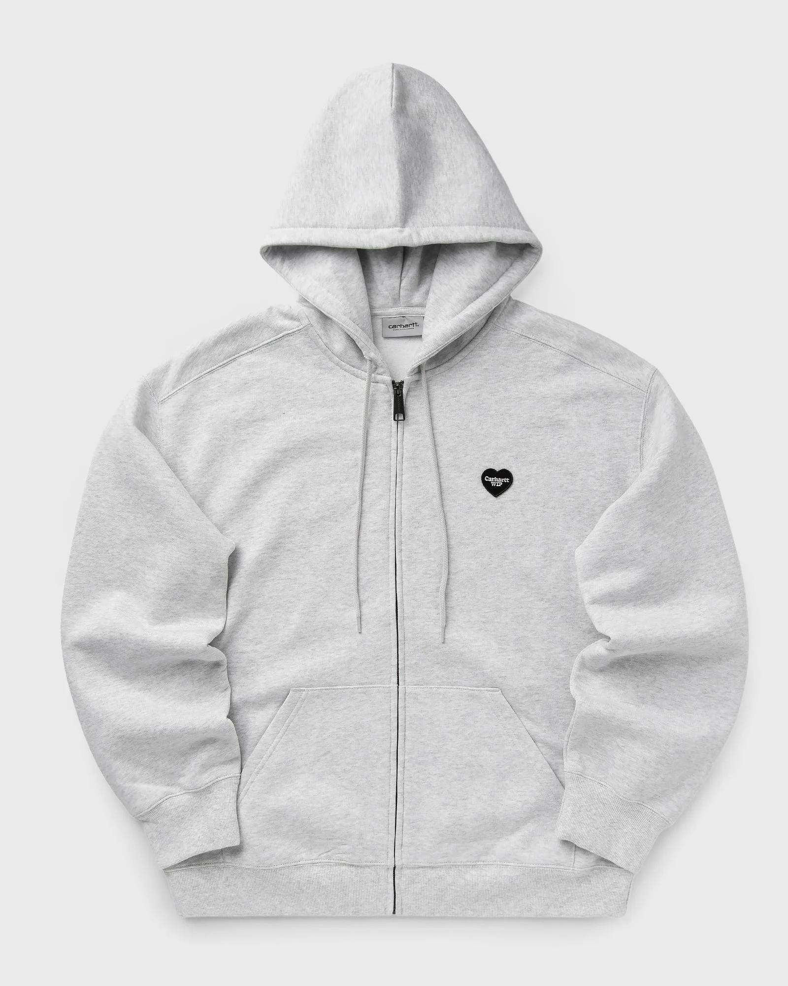 The Hooded Heart II Hartt Sweat Jacket by Carhartt WIP is made from a heavyweight, brushed polyester-cotton jersey with a fleece-like interior. The style has a balloon fit that is cut slightly wider and boxy, with dropped shoulders and ribbed cuffs. A woven heart label on the chest and a graphic print on the back round off the design. - Balloon fit - Adjustable hood - Kangaroo pocket - Zipper - Heart patch and graphic print Article Number: I035176-482.XX Gender: Men Color: Ash Heather Material: 80% Cotton, 20% Polyester