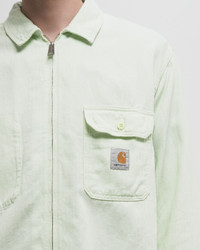 The Rainer Shirt Jacket by Carhartt WIP is made from a mid-weight cotton linen fabric with a herringbone pattern that has been piece-dyed for a softer feel and a more complex colorway. The style has a zipper and is finished with a chest pocket on the inside and outside. A woven square label rounds off the design. - Piece-dyed - Unlined - Zipper - One breast pocket on the outside, one breast pocket on the inside - Square label Article Number: I034826-2P6.GD Gender: Men Color: AIR GREEN GARMENT DYED Material: 62% Cotton, 38% Linen