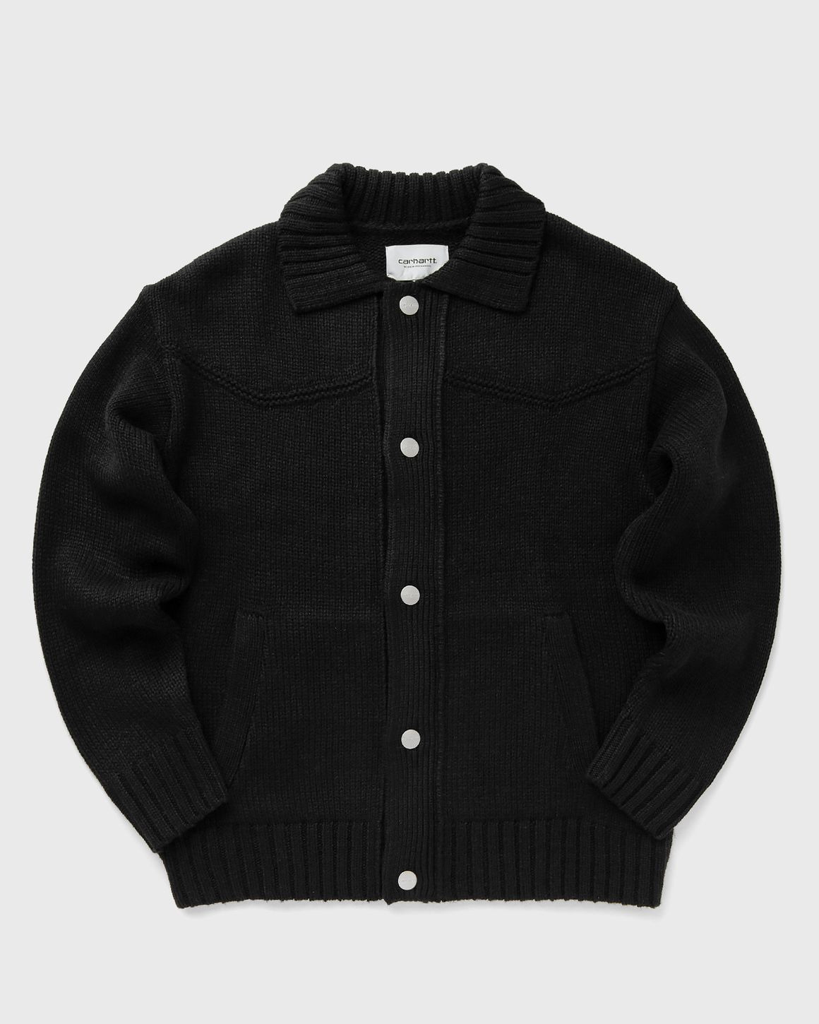 The Sante Fe Cardigan by Carhartt WIP is a heavy knit made from natural and synthetic fibers. It has a collar and is fastened with a button placket at the front. A flag label rounds off the design. - Button placket with metal buttons - Flag label Article Number: I034495-89.XX Gender: Men Color: black Material: 75% Acrylic, 10% Nylon, 15% Wool