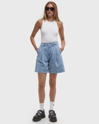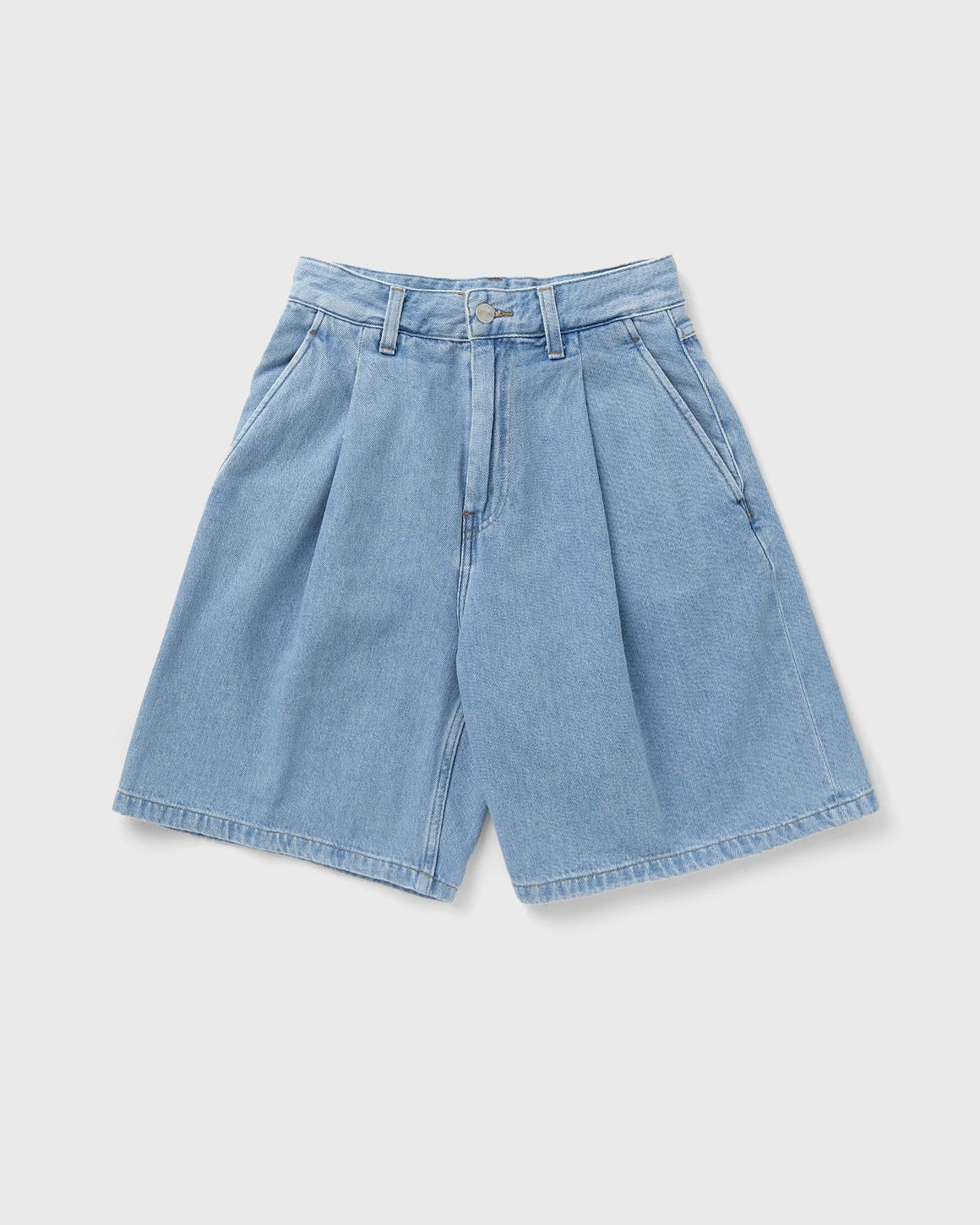 The loose fit Carhartt WIP Alta shorts are made from a heavy cotton denim and have a lighter look thanks to stone bleaching. The shorts feature pleats and a woven square label. - Loose fit, high waist - Pleats - Saddle stitching - Two side pockets, two back pockets - Zipper - Square label Article Number: I033345-01.12 Gender: Women Color: Blue Material: 100% Cotton