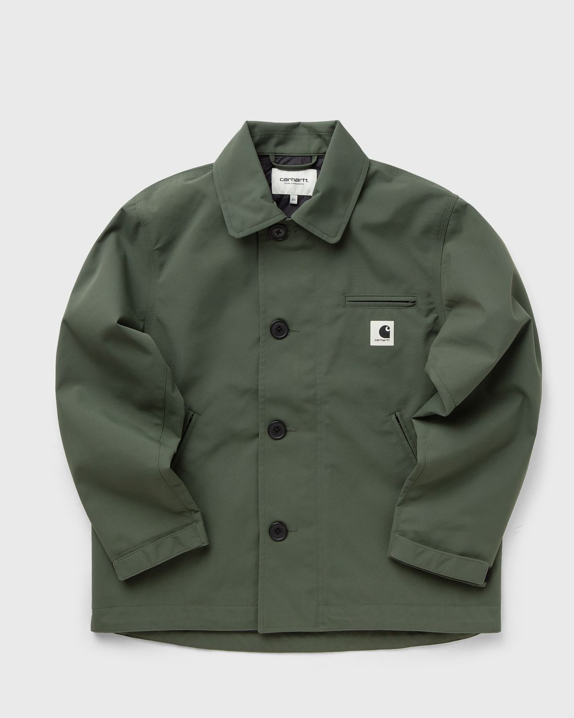 The Carhartt WIP Barnett Jacket is made from a lined, mid-weight nylon canvas with water-repellent capabilities. The style has a slight A-line silhouette that is adjustable at the hem and cuffs. There are three slit pockets with zippers on the front. A woven square label completes the design. - Water-repellent - Lined - Concealed zipper and buttons - Triple seams - Velcro-adjustable hem and cuffs - Inner chest pocket - Three front pockets with zippers - Square label Article Number: I035148-2ZX.XX Gender: Women Color: OPUNTIA Material: 100% Nylon