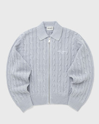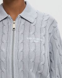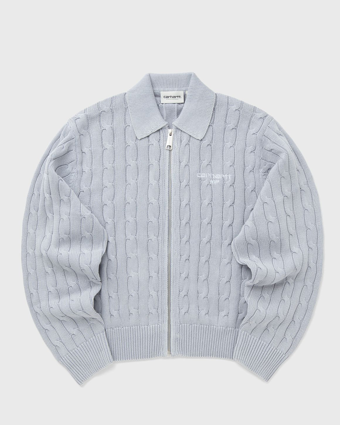 The Carhartt WIP Carter Sweater Jacket is a mid-weight cable knit design made from a cotton yarn. It has been piece-dyed for a softer feel and a more complex colorway. The style is ribbed at the collar, cuffs and hem and fastens with a zipper. There is an embroidered script logo on the chest. - 100% cotton (7 gg) - Zipper - Embroidered script logo Article Number: I035180-0N1.GD Gender: Women Color: BLUE FOG Material: 100% Cotton