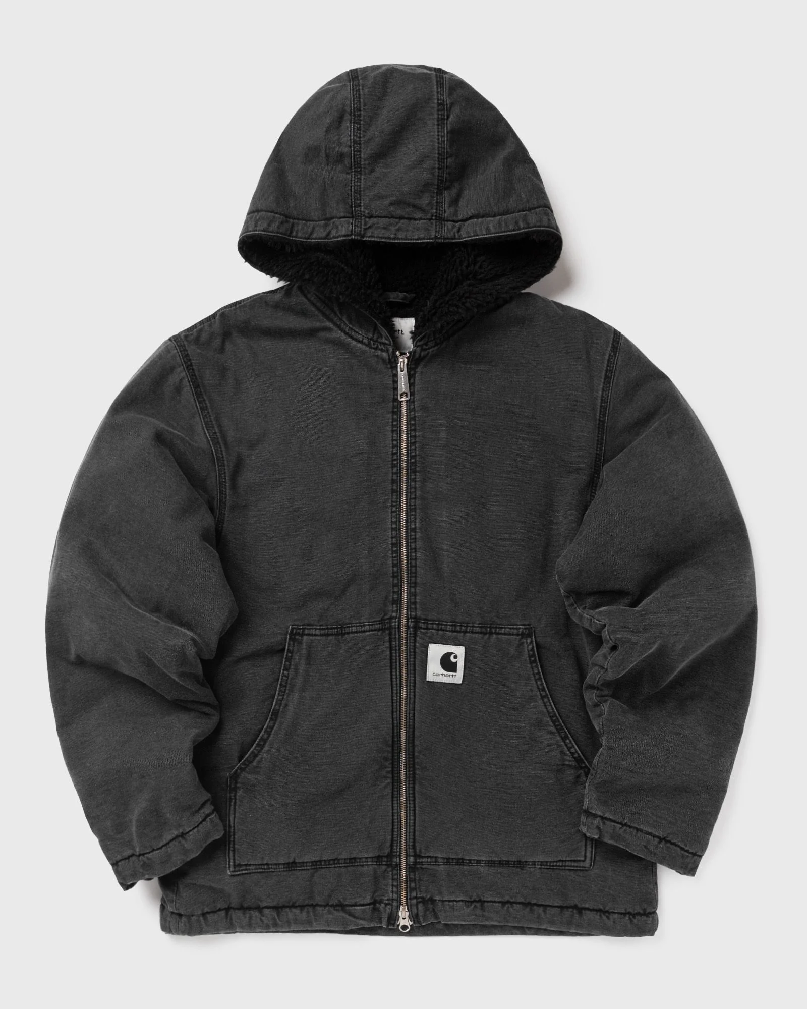 The Carhartt WIP Hooded Mitch Jacket is made from medium-weight cotton canvas with a plush lining and features a two-way zipper closure. Bar tacks at high-wear areas provide extra durability. A woven square label completes the design. - Two-way zipper - Bar tacking - Plush lining - Woven square label Article number: I036317-89.0J Gender: women Color: black Material: Full: 100% Cotton