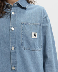 The loose-fitting Carhartt WIP L/S Marly Shirt is made from medium-weight cotton denim, which has been bleached to give it a lighter look. A woven square label completes the design. - Loose fit - Chest pocket - Buttons with logo - Square label Article Number: I035584-01.35 Gender: Women Color: Blue Material: 100% Cotton