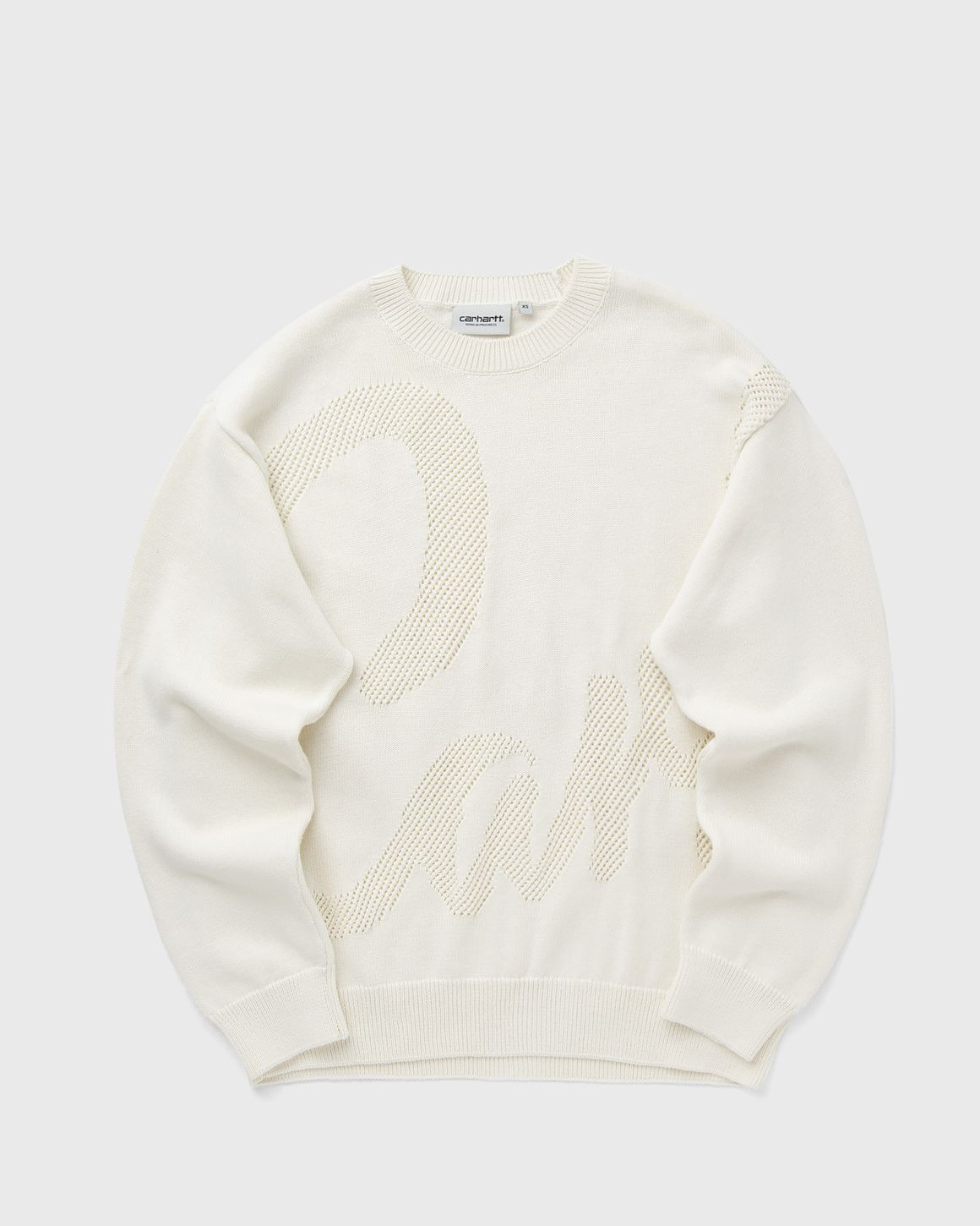 The Carhartt WIP Perla Sweater is a medium-weight knit style and is made from a cotton yarn. The sweater features a large logo lettering embedded in the knit pattern. - Crew neck - Ribbed cuffs and hem - Knitted logo lettering Article Number: I035185-05.XX Gender: Women Color: Natural Material: 100% Cotton