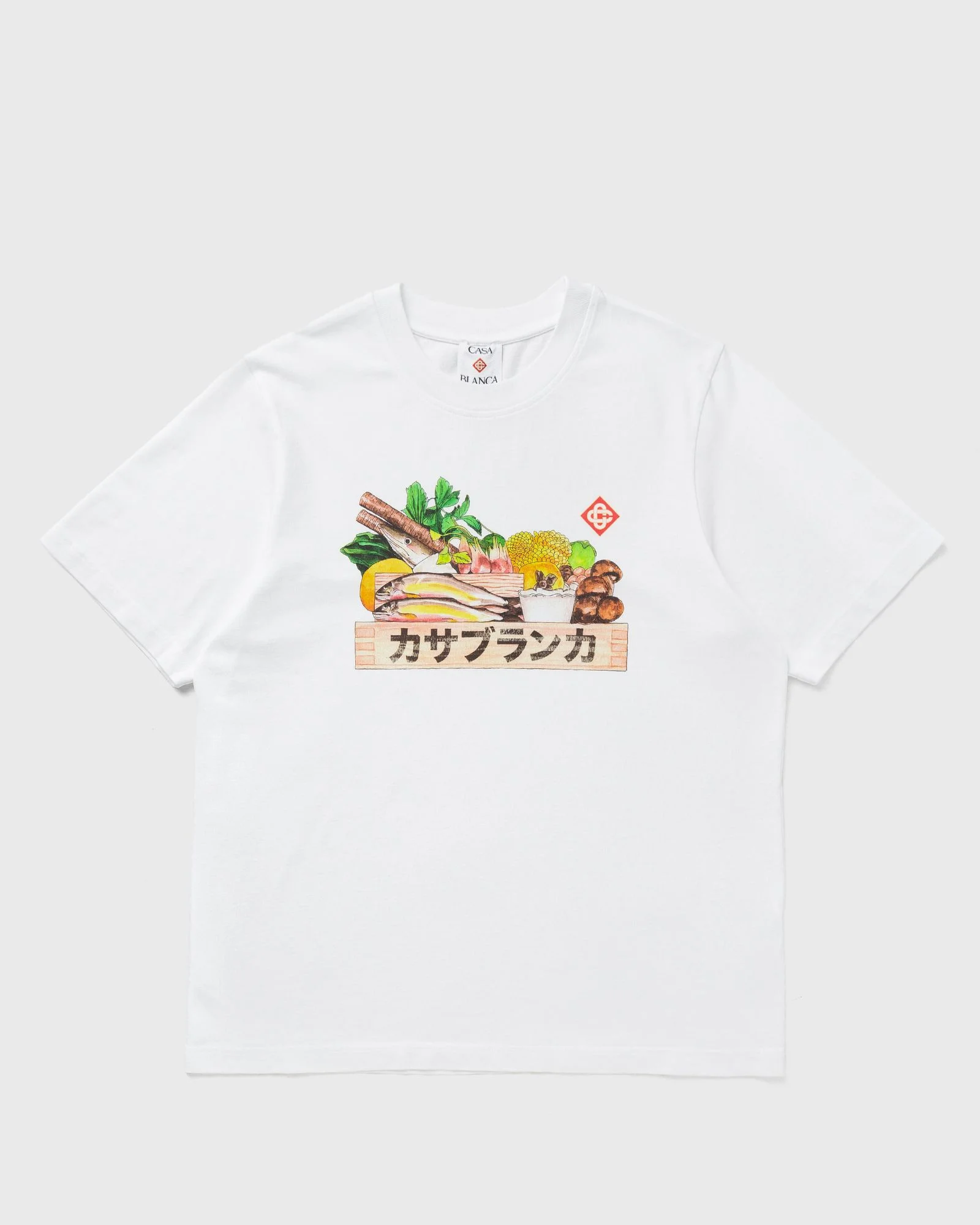 The Casablanca Ingredients Printed T-Shirt impresses with its soft feel and sustainable quality. The striking graphic print shows a playful arrangement of various ingredients and the brand's signature Casablanca logo. - Round neckline - Short sleeves##- Graphic print This item is partly made of certified, recycled and sustainable materials, reducing the global amount of waste and conserving primary raw materials. Discover a wide range of sustainable items now at BSTN! Article Number: M-AW25-JTS-001-03 Gender: Men Color: CASABLANCA INGREDIENTS Material: 100% Cotton