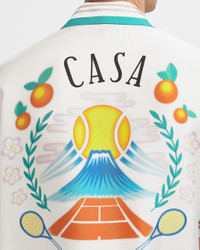 The Casa Way Silk Shirt from Casablanca is made from high-quality silk twill and impresses with a colorful artwork on the breast pocket and back - inspired by tennis and nature motifs. The classic Cuban collar, a concealed button placket with corozo buttons and contrasting stripes on the collar, sleeves and hem lend the shirt a playful elegance. - Cuban collar - Concealed button fastening - Interlocking CC logo corozo buttons - Stripe details on the collar, cuffs and hem Article Number: MPF25-SH-003-07 Gender: Men Color: SILK Material: 100% Silk
