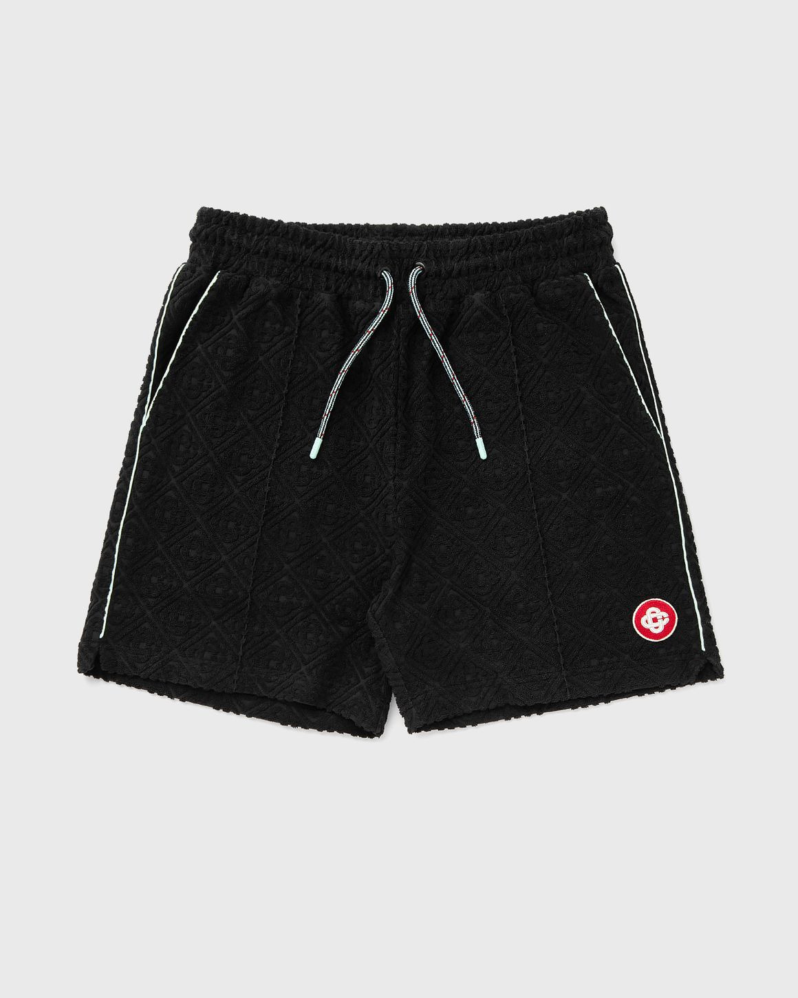 The relaxed fit Monogram terry shorts from Casablanca combine a casual summer feel with a luxurious tennis aesthetic: made from a Monogram terry fabric, they impress with their soft feel and subtle jacquard texture. An elastic waistband with a gold-finished drawstring ensures comfort, while piping on the sides and pockets and pintuck stitching add stylish details. - Elastic waistband - Drawstring with gold lace - Piping details on the front and back pockets and on the sides - Pintuck stitching - Back pocket with zipper Article Number: MPF25-JTR-271-02 Gender: Men Color: MONOGRAM Material: 86% Cotton, 13% Polyamide, 1% Spandex/elastane