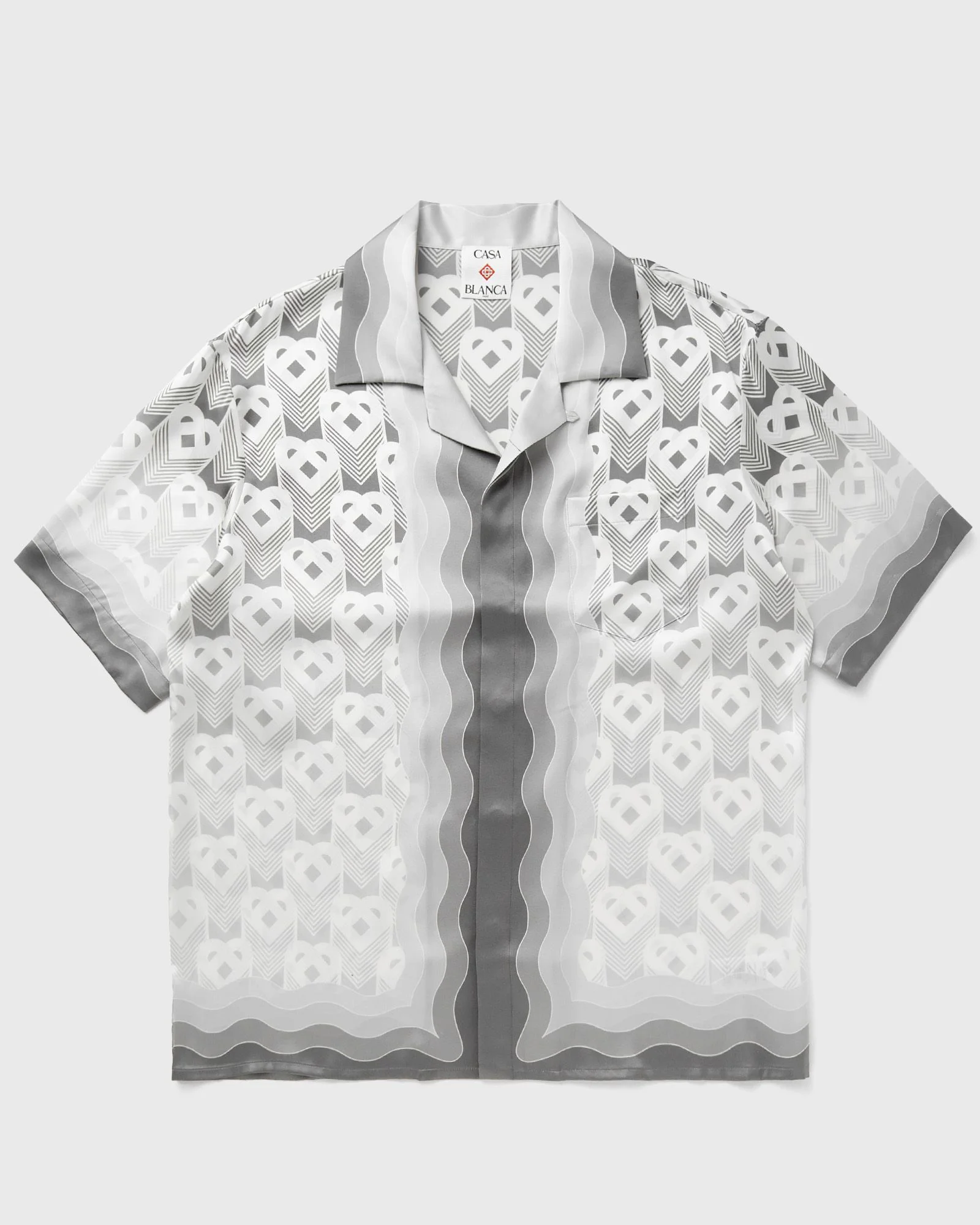 The Cuban Collar Shortsleeve Shirt by Casablanca is a short-sleeved style with an all-over print featuring seasonal motifs and the brand's logo. The shirt is made from pure silk and equipped with a Cuban collar, a button fastening and a breast pocket. - Printed silk twill fabric - Concealed button placket - Chest pocket Article number: U-MPS25-SH-003-02 Gender: men Color: GREY GRADIENT HEART MONOGRAM Material: 100% Silk