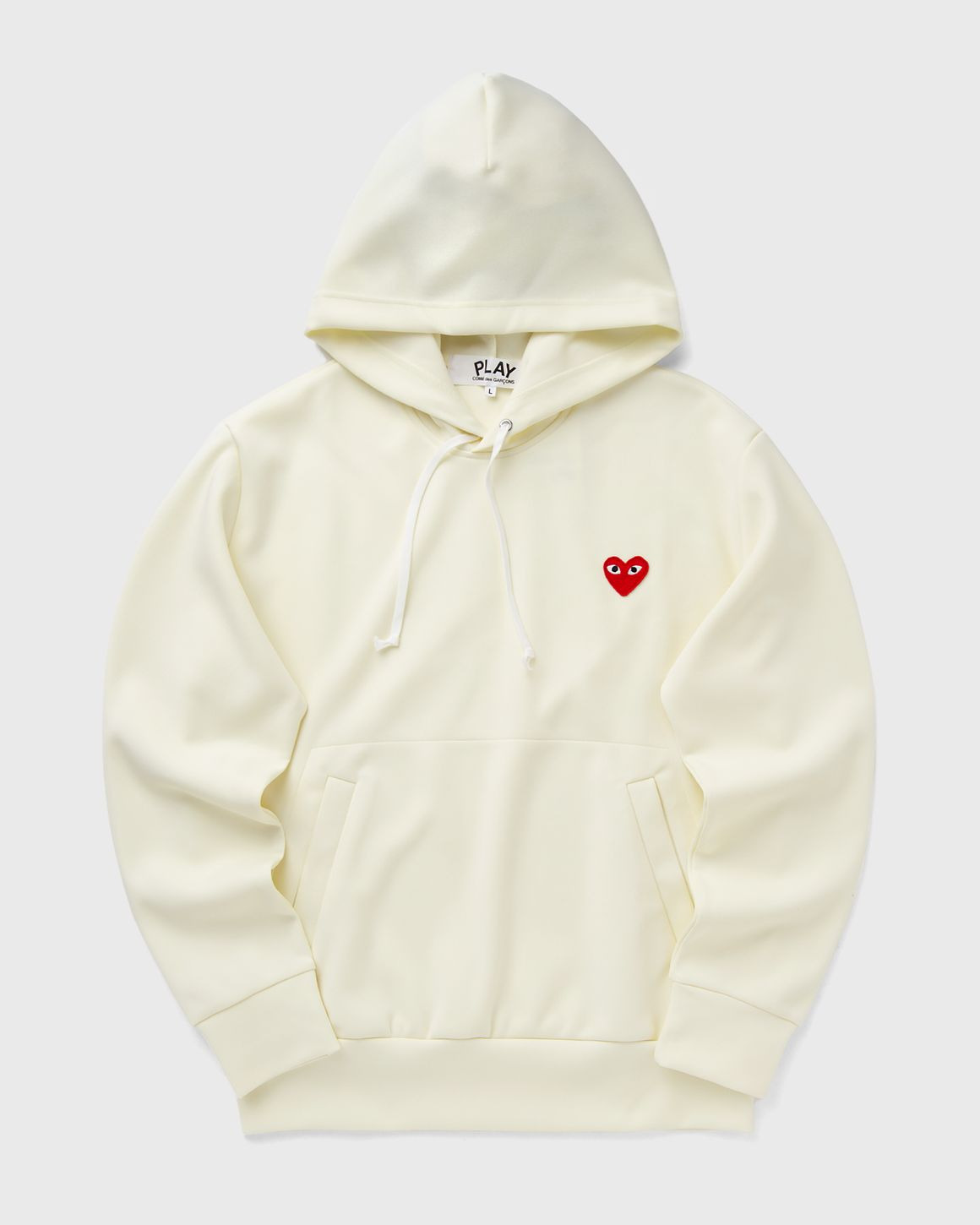 The Comme des Garcons Play hoodie combines casual sports style and avant-garde aesthetics. Made from soft material and with ribbed cuffs and hem, it is also comfortable to wear. - Adjustable hood - Side pockets - Heart print and embroidery Article Number: AX-T174-051-3 Gender: Men, Women Color: IVORY Material: 100% Polyester