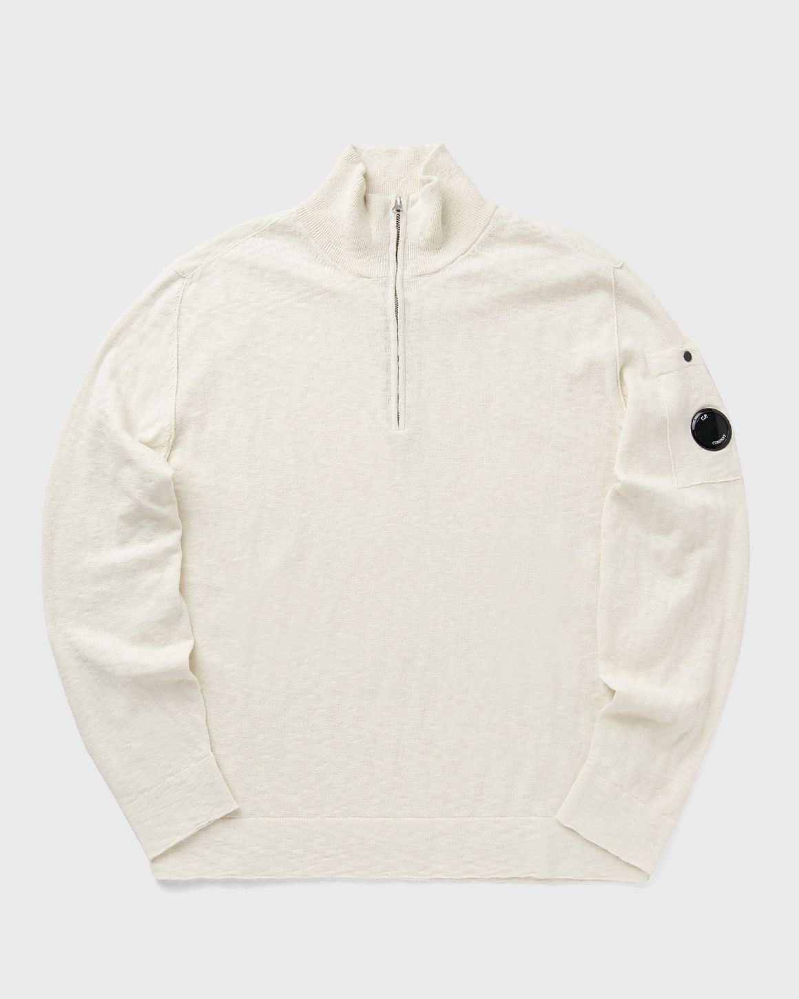 The HALF ZIP KNIT sweater from C.P. Company impresses with its clean design and high-quality workmanship. The half zipper detail gives the sweater a sporty look, while the soft material ensures optimum comfort. - Half zip - Ribbed cuffs and hem - Lentil detail on the sleeve Article Number: 18CMKN304A110373A-103 Gender: Men Color: GAUZE WHITE Material: 78% Cotton, 22% Polyamide