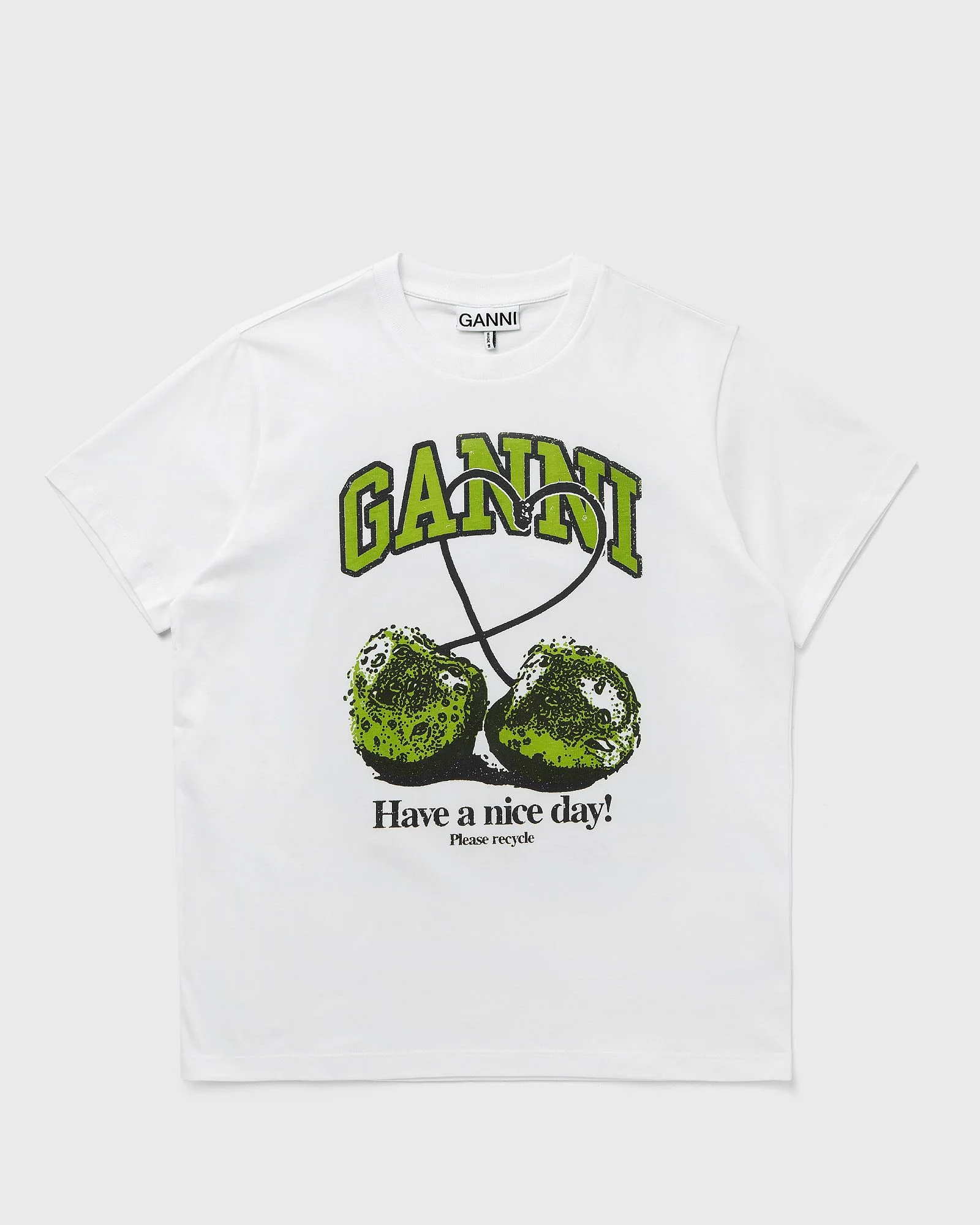 The Ganni Basic Jersey Cherry Relaxed T-shirt with a round neckline is a relaxed essential for every day. It has short sleeves and a graphic Ganni print on the front. Pure organic cotton ensures soft comfort. - Round neckline - Short sleeves - Graphic print Article number: T4291-151 Gender: women Color: BRIGHT WHITE Material: Full: 100% Cotton