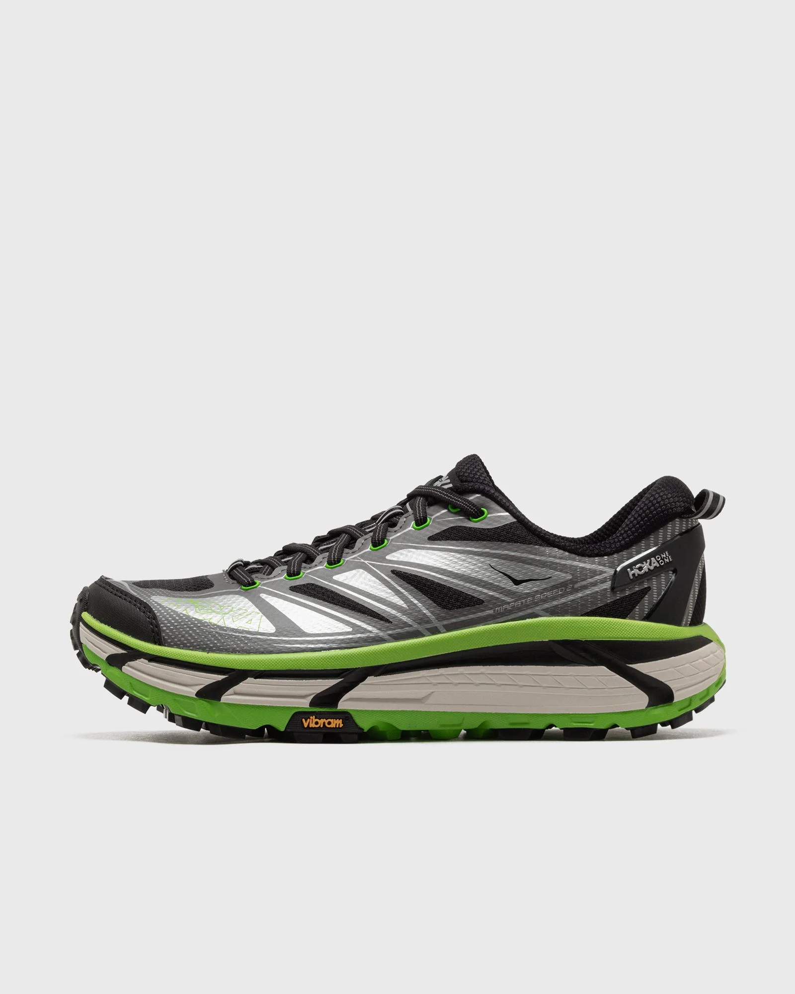 The HOKA One One Mafate Speed 2 is a lightweight unisex trail and hiking shoe. It offers support and cushioning in technical terrain, even over long distances. The wide Active Foot Frame provides more support, while the well-tuned Meta-Rocker guarantees smooth transitions while running. The outsole features deep flex grooves that adapt to different surfaces, and the 5mm thick Vibram Megagrip tread offers secure grip on even the most difficult terrain. - Lightweight, seamless SpeedFrame constructionProtective outer monomesh material - Lightweight, external TPU heel counter support - Early Metarocker geometry - Lightweight, cushioned midsole with CMEVA top layer - Vibram Megagrip outsole - 4mm heel-to-toe drop - Strategically placed, abrasion-resistant rubber reinforcements Article number: 1126851-BCKLC Gender: men Color: BLACK / ELECTRIC GREEN Material: Upper material: 100% Synthetic/Textile