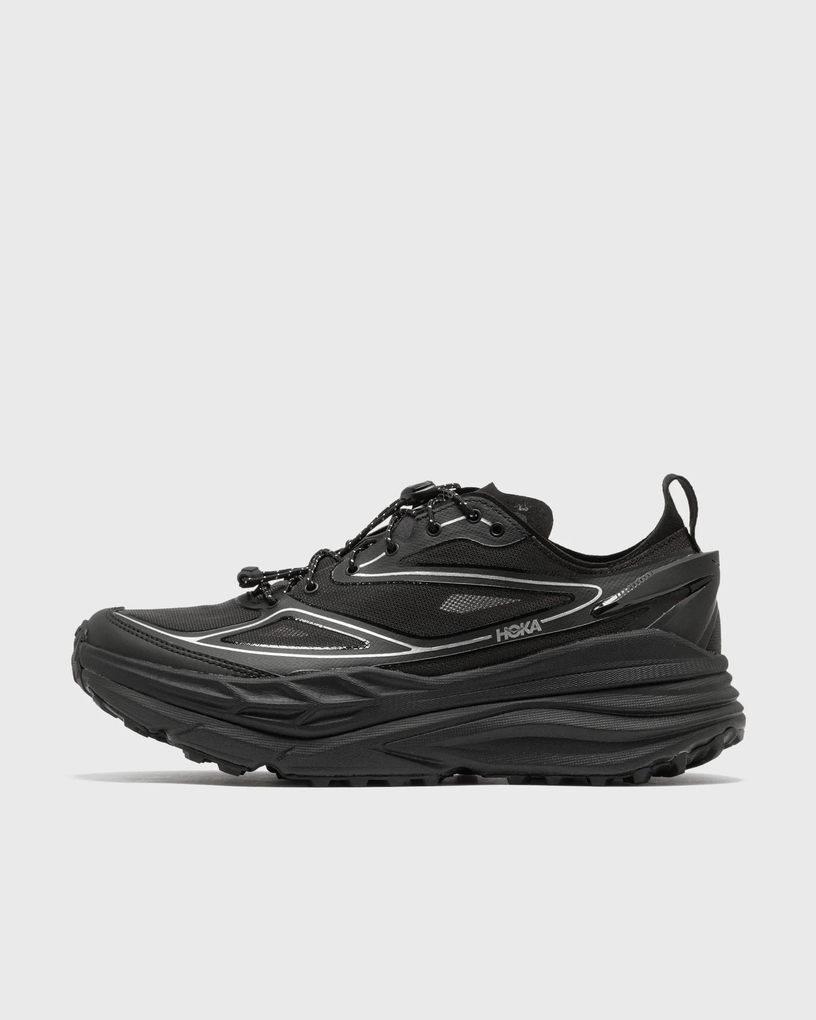 The Stinson One7 from Hoka One One combines iconic design with modern trail technology. With the proven cushioning and tooling of the Stinson 7, a translucent upper, an internal cage inspired by the Stinson Lite, and a 3D-molded TPU heel clip, the shoe offers a distinctive look. Despite its rugged look, it is surprisingly lightweight and fully ready for demanding trails. - Translucent mono mesh upper - Microfiber collar - 3D-molded TPU heel clip - Oversized bird logo on the inside - Quick lacing - Internal cage details - Stabilizing H-Frame - CMEVA foam - Multidirectional lugs Article number: 1168931-BKSV Gender: men Color: BLACK / SILVER Material: 30% Rubber, 70% Synthetic/Textile
