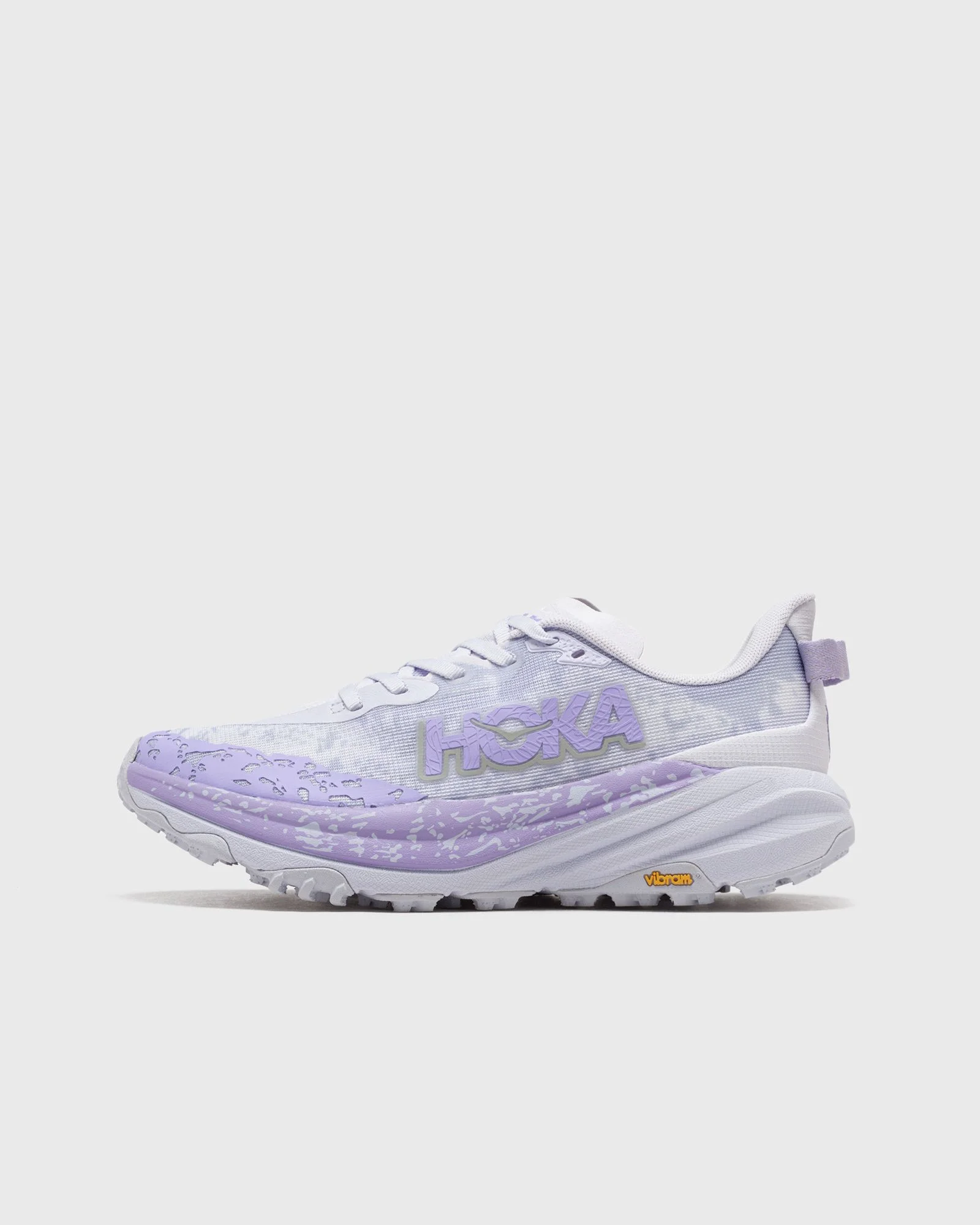 The HOKA One One Speedgoat 6 is a unique running shoe that provides a responsive ride with good grip on challenging terrain. The shoe combines HOKA's proven cushioning with excellent grip and ultra-lightweight materials, making it perfect for challenging terrain. The new edition features an upper made of breathable fabric, an integrated chassis system that hugs the foot, an even softer tongue with two gussets and a revised alignment of the cleats, which are inspired by the hooves of a goat in reference to the shoe's name. - Lightweight fabric upper - Integrated chassis system - Dual gusset tongue - Dynamic vamp - Protective toe cap - Vibram Megagrip with grippy lugs - Revised lug alignment - Lightweight, responsive midsole composite - Lightweight, more responsive foam - 5mm lugs - Vegan Article number: 1147811-SLWS Gender: women Color: STARLIGHT GLOW / ASTER FLOWER Material: 100% Synthetic/Textile