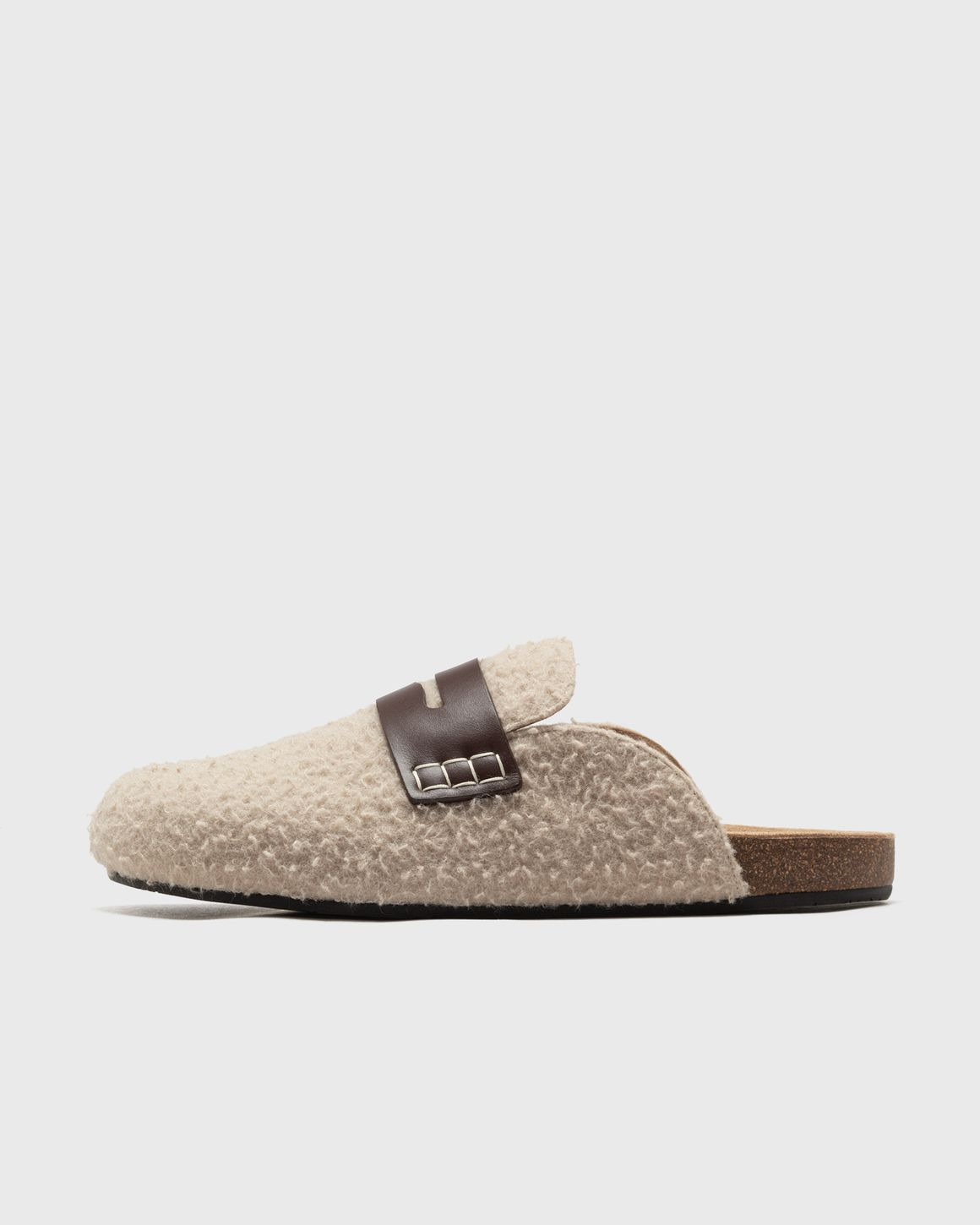 The casual and comfortable Felt loafers from JW Anderson are perfect for a casual look with an elegant touch. The soft felt material ensures a comfortable feel, while the classic slip-on silhouette creates a timeless look. - Textured felt loafer - Calfskin front strap and binding - Rounded toe Article Number: LF0029-FA0468-132 Gender: Men Color: BEIGE Material: 40% Leather, 40% Wool, 20% Corc