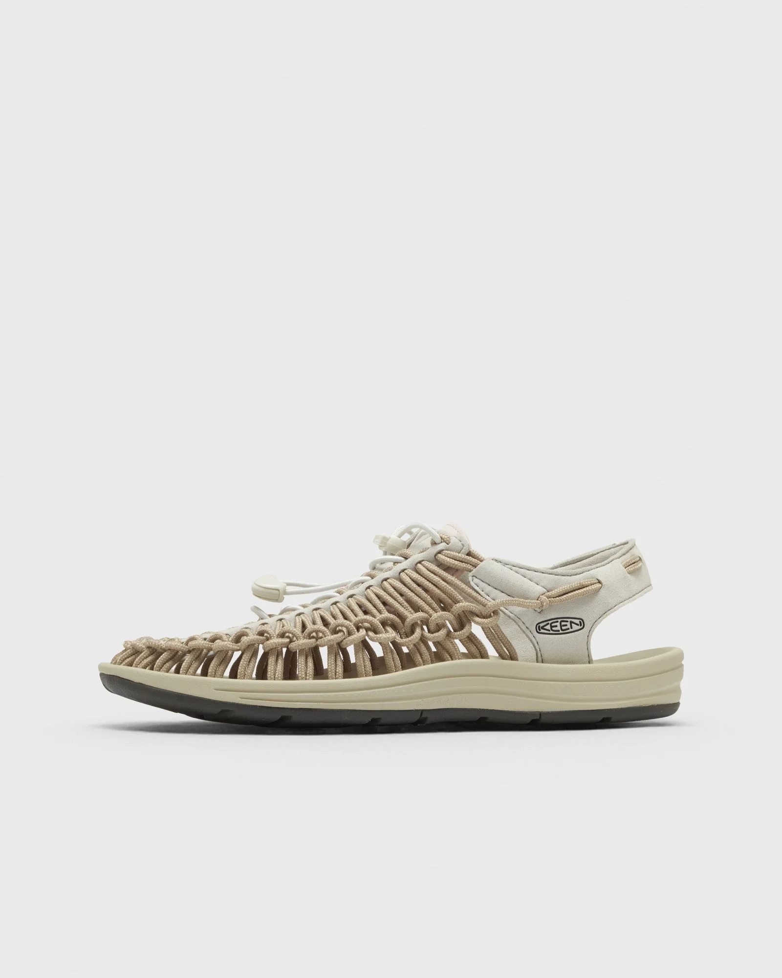 The Uneek by KEEN is based on the characteristic ‘Two Cords, One Sole’ construction: two freely movable cords adapt to the foot and ensure a perfect fit, freedom of movement, stability, and secure support—ideal for everyday use, outdoor adventures, or travel. - Contoured fit - Adapts to the shape of the foot and ensures a secure hold - Recycled plastic bungee and lace closure for an instantly secure fit - Cushioning midsole to absorb shocks - Razor-siped outsole drains water and provides exceptional grip - Recycled PET plastic - Eco Anti-Odour for natural odor control Article number: 1032187 Gender: women Color: VAPOR/PALE LILAC Material: 50% Rubber, 50% Synthetic/Textile
