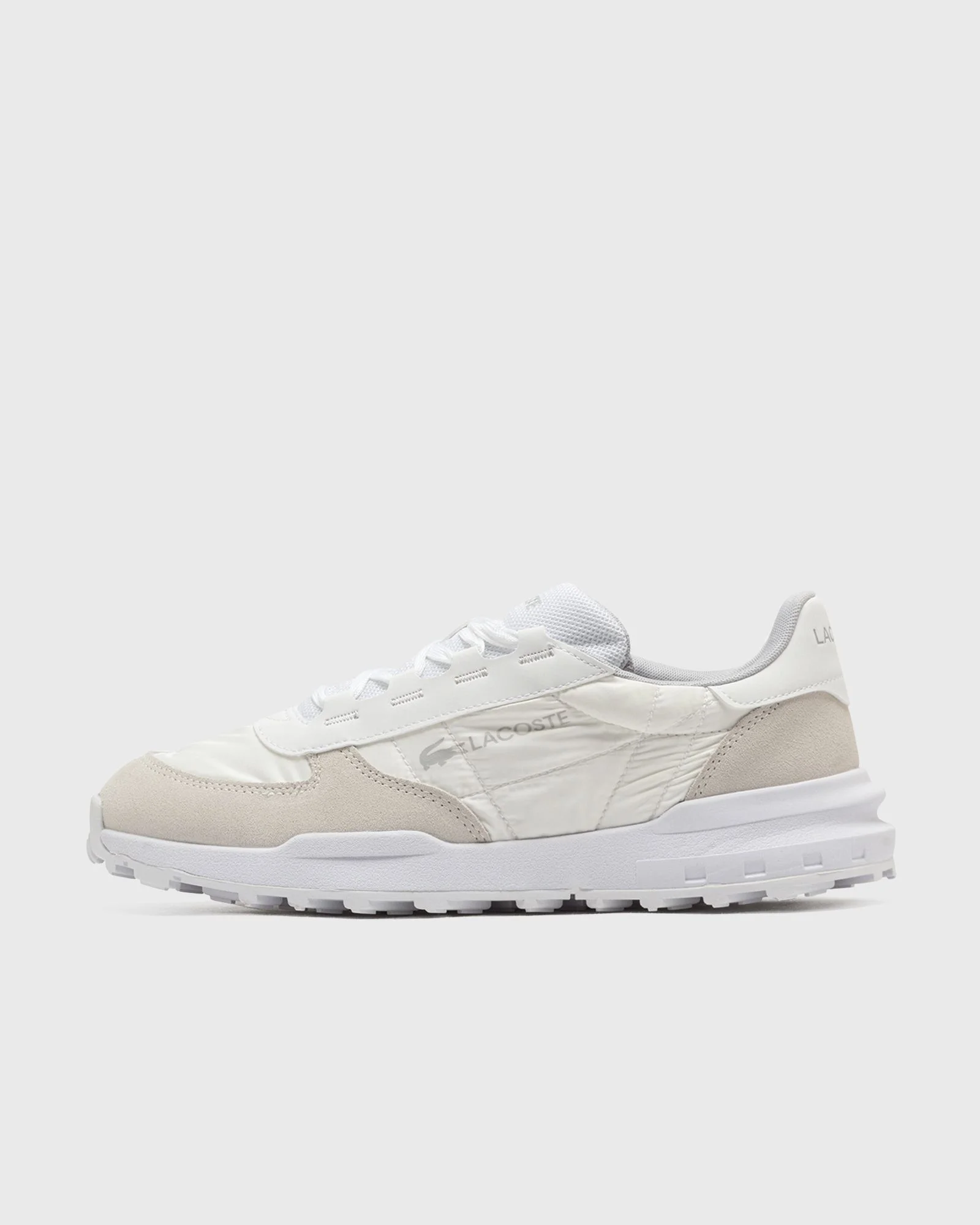 The Elite Active Evo by Lacoste is a sophisticated alternative to classic sneakers for everyday wear. The high-quality nylon upper is accented with decorative stitching and suede overlays, while silicone branding details on the sides give the shoe a modern, stylish touch. - Nylon upper material - Suede on the heel and toe cap - Mesh lining - Rubber outsole - Silicone branding print on the quarter panel Article number: 50SMA0084-14X Gender: men Color: WHT/LT GRY Material: 30% Rubber, 30% Leather, 40% Synthetic/Textile