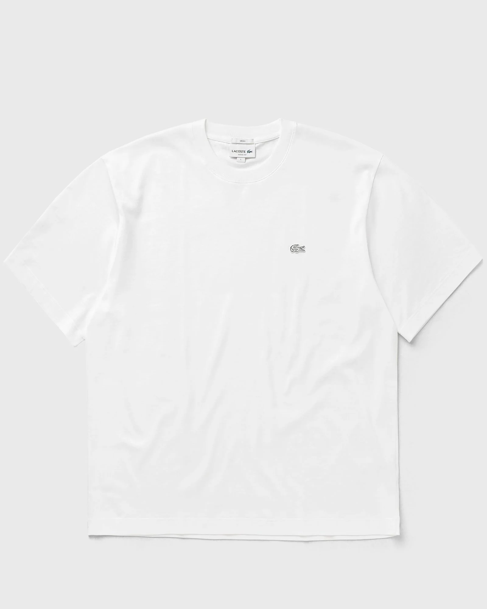 The Lacoste T-shirt is made from comfortable, heavyweight cotton jersey with a loose cut and minimalist design. A signature crocodile and decorative stitching round off the design. - Heavy jersey with organic cotton and recycled polyester from production waste - Relaxed fit, slightly dropped shoulders - Color-coordinated crocodile with black decorative stitching on the chest Article number: TH7744-001 Gender: men Color: white Material: 100% Cotton