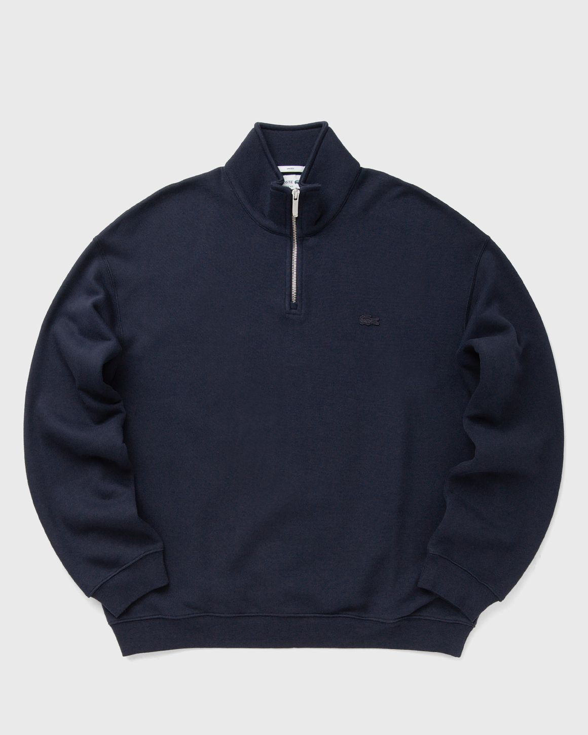 The Lacoste Heavy Fleece Zipper Neck Sweatshirt combines casual elegance and comfort in a modern design. Made from heavyweight cotton fleece, it offers warmth and a soft feel with a loose fit and dropped shoulders. The high zipped collar with branded metal zipper and ribbed cuffs give the sweatshirt a sporty-clean aesthetic. - Heavyweight fleece made from organic cotton and recycled polyester from production waste - Loose fit, dropped shoulders - High collar with zipper and metal logo slider - Ribbed waistband and cuffs - Color-coordinated crocodile with black decorative stitching on the chest Article Number: SH7759-166 Gender: Men Color: Navy Blue Material: 100% Cotton