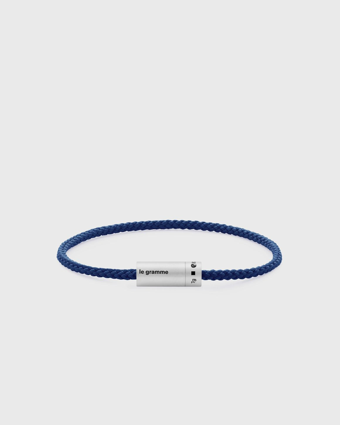 Inspired by industrial design and, more specifically, by the architecture of cable-stayed bridges, the iconic NATO Cable Bracelet Le 7g from le gramme juxtaposes minimalist design with high technicality, featuring a twisted precious metal cable sealed by a cylindrical clasp. - 925 sterling silver - Made in France - Hallmarked - Weight: 7g - Clasp diameter: 7mm - Clasp length: 18mm - Cable diameter: 3mm For the right size, go one size up from your wrist circumference measurement. For example: If your wrist measures 16.5 cm, your size is 17 cm. This item is partly made of certified, recycled and sustainable materials, reducing the global amount of waste and conserving primary raw materials. Discover a wide range of sustainable items now at BSTN! Article Number: CARBRNBR051_05 Gender: Men Color: ROYAL BLUE Material: 100% polyester and sterling silver