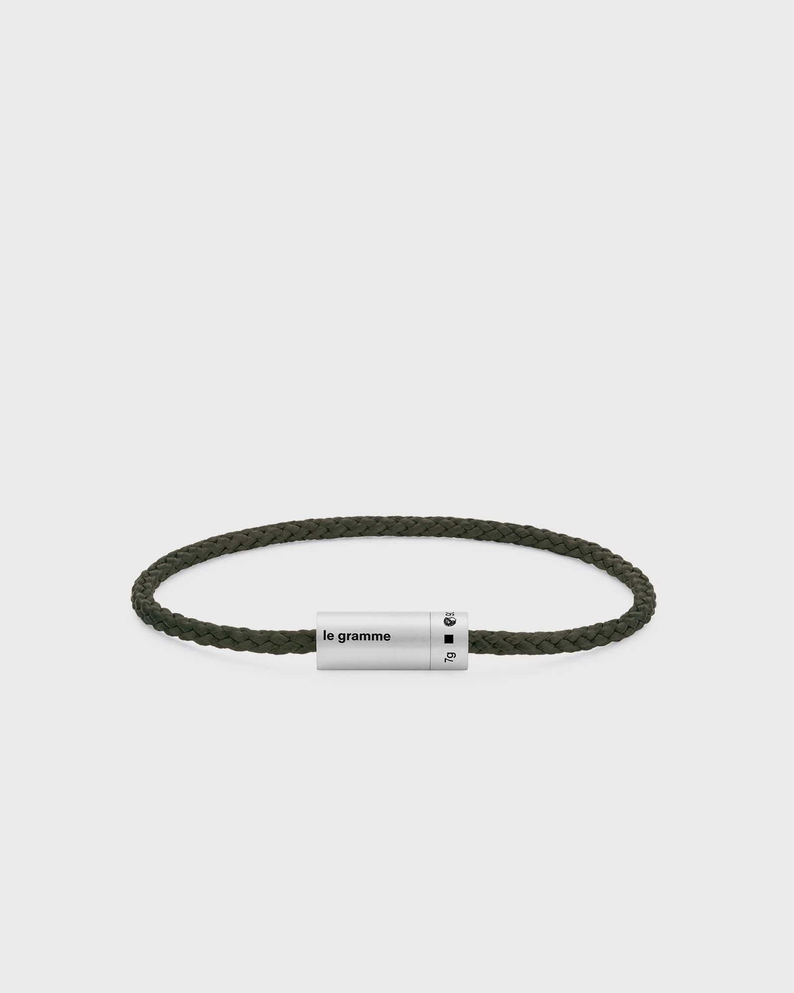 Inspired by industrial design and, more specifically, by the architecture of cable-stayed bridges, the iconic NATO Cable Bracelet Le 7g from le gramme juxtaposes minimalist design with high technicality, featuring a twisted precious metal cable sealed by a cylindrical clasp. - 925 sterling silver - Made in France - Hallmarked - Weight: 7g - Clasp diameter: 7mm - Clasp length: 18mm - Cable diameter: 3mm For the right size, go one size up from your wrist circumference measurement. For example: If your wrist measures 16.5 cm, your size is 17 cm. Article number: CARBRNKA051_05 Gender: men Color: KHAKI Material: 100% sterling silver & polyester