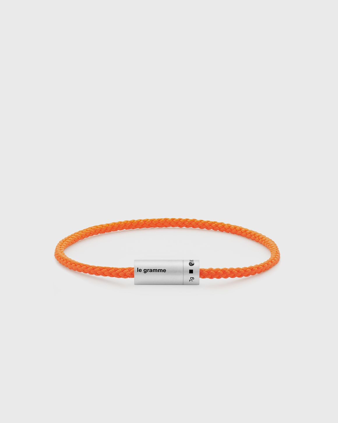 Inspired by industrial design and, more specifically, by the architecture of cable-stayed bridges, the iconic NATO Cable Bracelet Le 7g from le gramme juxtaposes minimalist design with high technicality, featuring a twisted precious metal cable sealed by a cylindrical clasp. - 925 sterling silver - Made in France - Hallmarked - Weight: 7g - Clasp diameter: 7mm - Clasp length: 18mm - Cable diameter: 3mm For the right size, go one size up from your wrist circumference measurement. For example: If your wrist measures 16.5 cm, your size is 17 cm. This item is partly made of certified, recycled and sustainable materials, reducing the global amount of waste and conserving primary raw materials. Discover a wide range of sustainable items now at BSTN! Article Number: CARBRNOF051_05 Gender: Men Color: ORANGE Material: 100% sterling silver & polyester