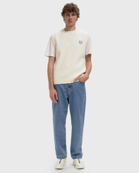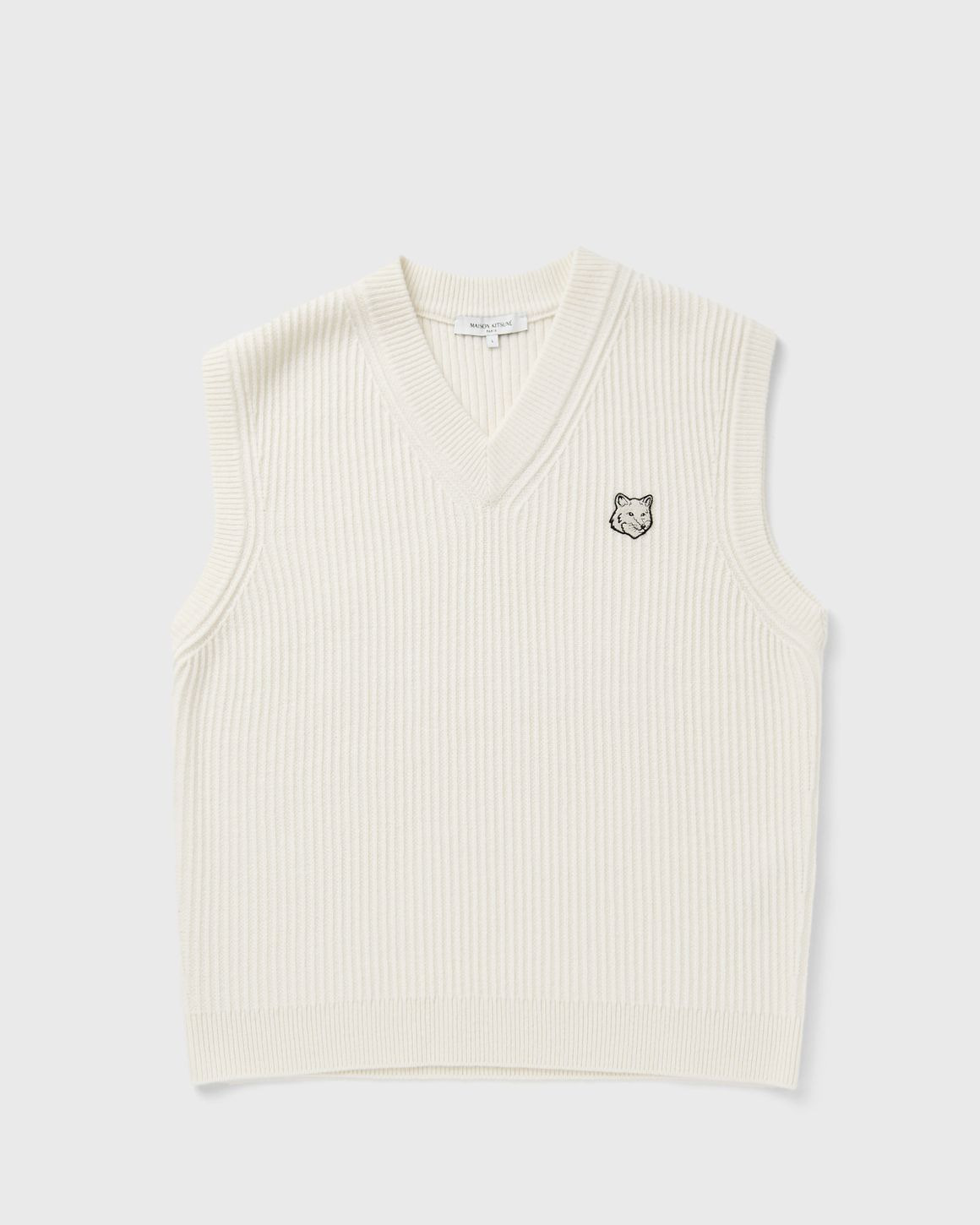 The FOX HEAD WOOL RIBBED VEST by Maison Kitsune features high-quality craftsmanship and minimalist chic. Made from 100% wool, it boasts a regular fit with a fine knit structure, V-neck, and ribbed trim on the collar, armholes, and waistband. A color-coordinated, embroidered fox head patch on the chest adds subtle branding details. - Sleeveless ribbed wool sweater - Regular fit - V-neck - Sleeveless - Ribbed knit at the neckline, armholes, and waistband - Ribbed knit - Color-coordinated fox head embroidered patch on the chest Article Number: PM00810KT1149-P700 Gender: Men Color: ECRU Material: 100% Merino wool