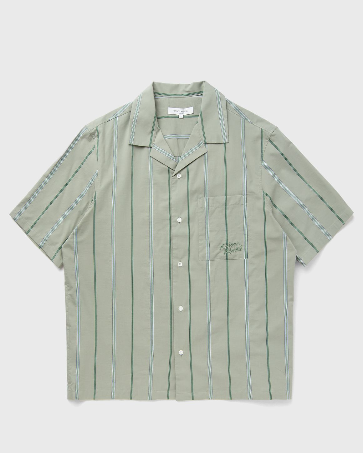 The Resort shirt by Maison Kitsune is perfect for relaxed days at the beach or for a laid-back city look. The lightweight material ensures optimum comfort, while the subtle pattern rounds off the design. - Heritage stripe shirt in cotton poplin with short sleeves - Boyx fit - Shirt collar - Engraved button fastening - Attached chest pocket - Maison Kitsune signature embroidered on the chest Article Number: OM00421WC5029-0078 Gender: Men Color: VERT-DE-GRIS Material: 85% Cotton, 15% Polyamide