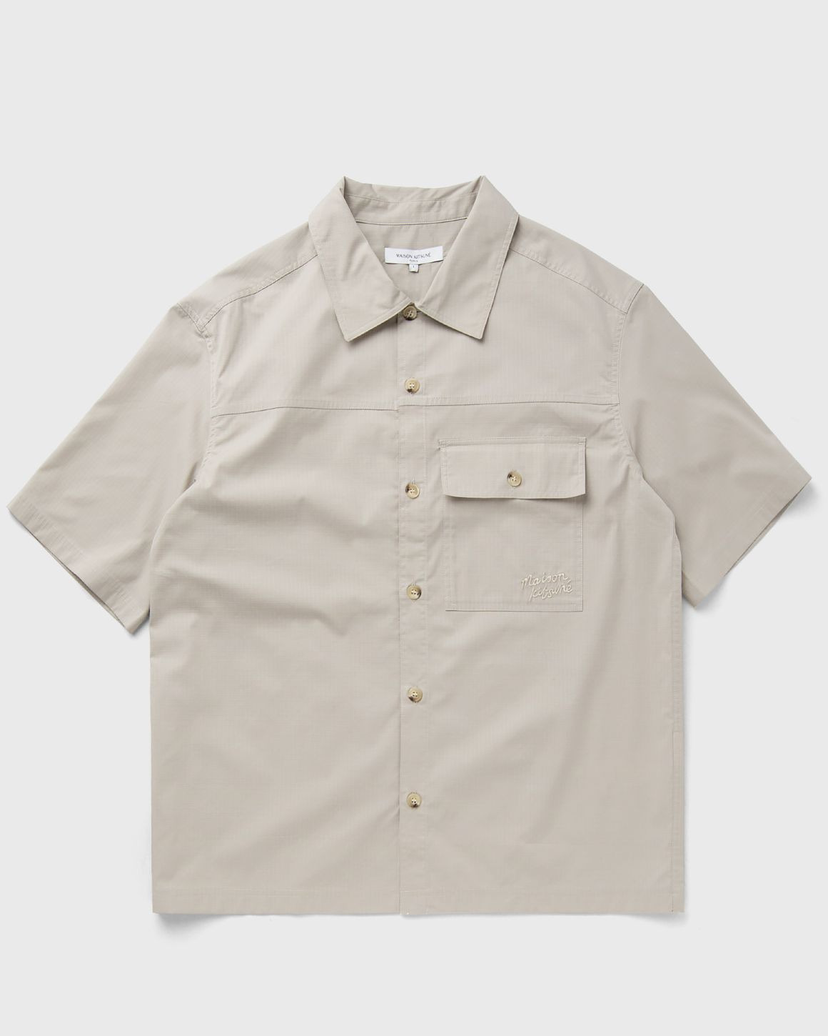 The Maison Kitsune short sleeve overshirt is perfect for summer and can be combined in a variety of ways. The high-quality finish and minimalist design make this piece an essential for any closet. - Short sleeve shirt made from cotton ripstop - Boxy cut - Shirt collar - Button fastening - Attached chest pocket with button flap - Maison Kitsune signature embroidered on the pocket Article Number: OM00429WW9020-0119 Gender: Men Color: TRUFFLE Material: 67% Cotton, 33% Polyester