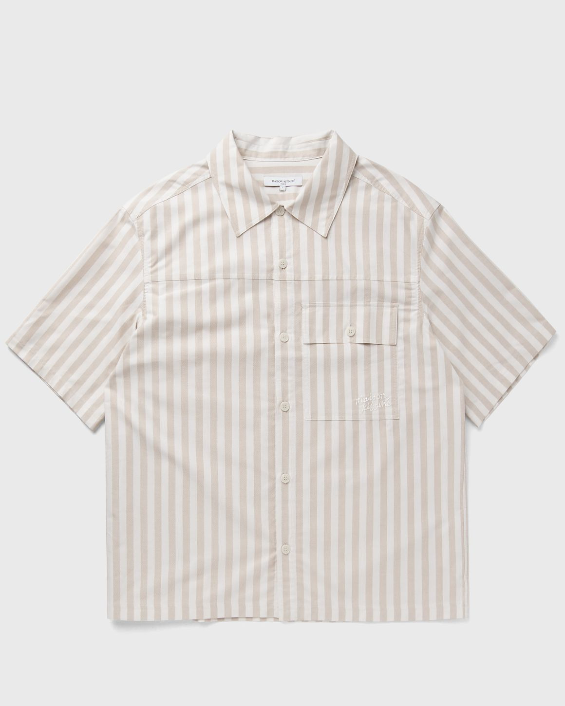 The Maison Kitsune short sleeve overshirt is perfect for summer and can be combined in a variety of ways. The high-quality finish and minimalist design make this piece an essential for any closet. - Short sleeve shirt made from cotton ripstop - Boxy cut - Shirt collar - Button fastening - Attached chest pocket with button flap - Maison Kitsune signature embroidered on the pocket Article Number: OM00429WC5045-0189 Gender: Men Color: CORK STRIPE Material: 100% Cotton